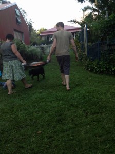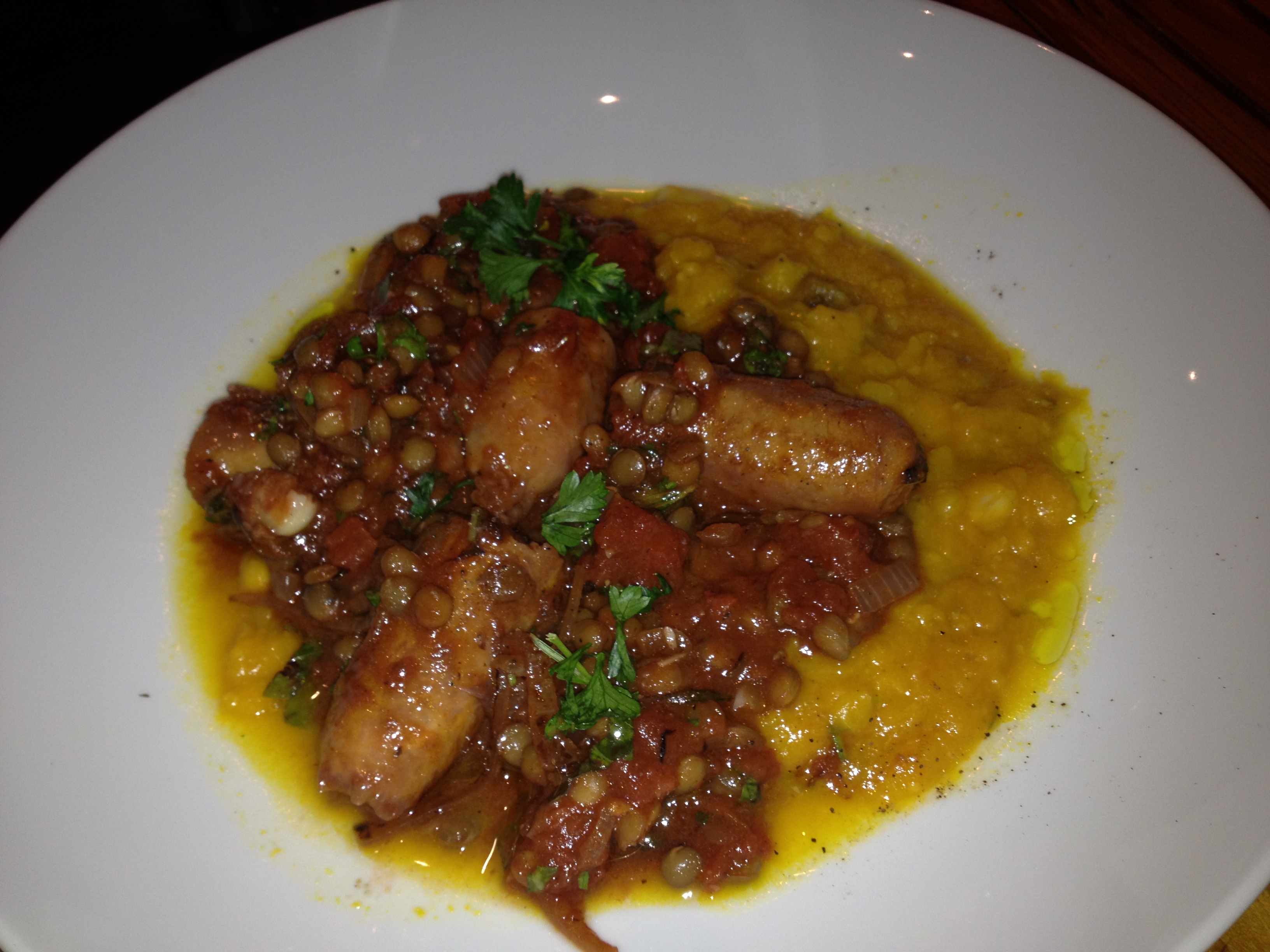 Heat a fuck off big paella pan (just because you have one and they’re so damn sexy), and fry off sausages, sliced onion, garlic, rosemary and a couple of anchovies. Once they are coloured deglaze with ½ a bottle of red (you know what the other half is for, yeah?). Add 2 tins of diced tomatoes and a tin of French lentils. Check seasoning. Garnish with chopped parsley, basil and rosemary from the garden