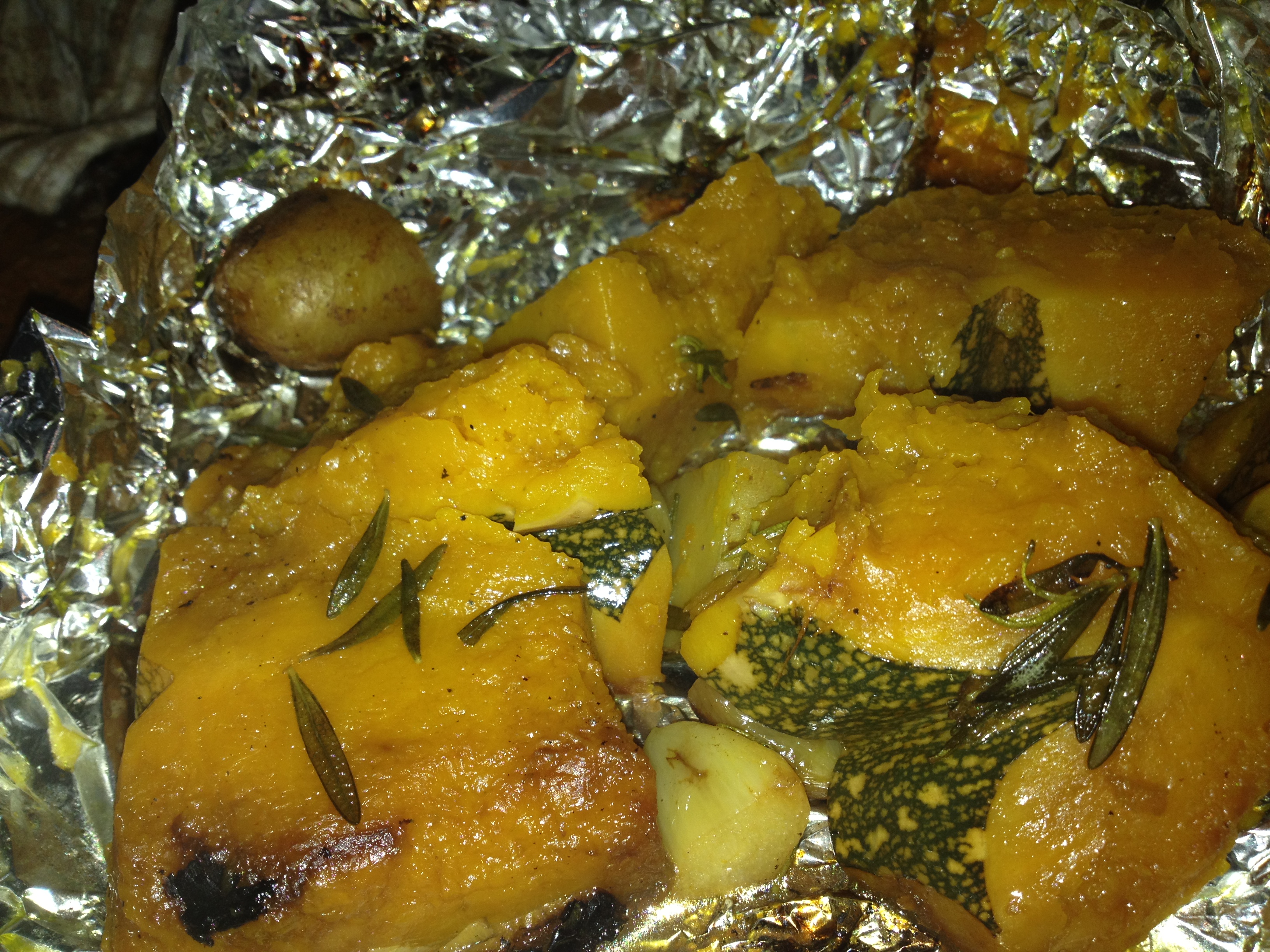 Season some pumpkin with rosemary, garlic, salt and pepper, and wrap in alfoil. Chuck it in the coals for as long as the sausages take to cook. This is gonna be your mash