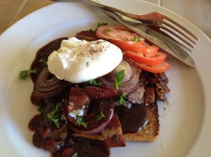 This one has a bit of red wine and fresh thyme in the gravy, and the onions were deglazed with red wine vinegar. Once again, eff yes!