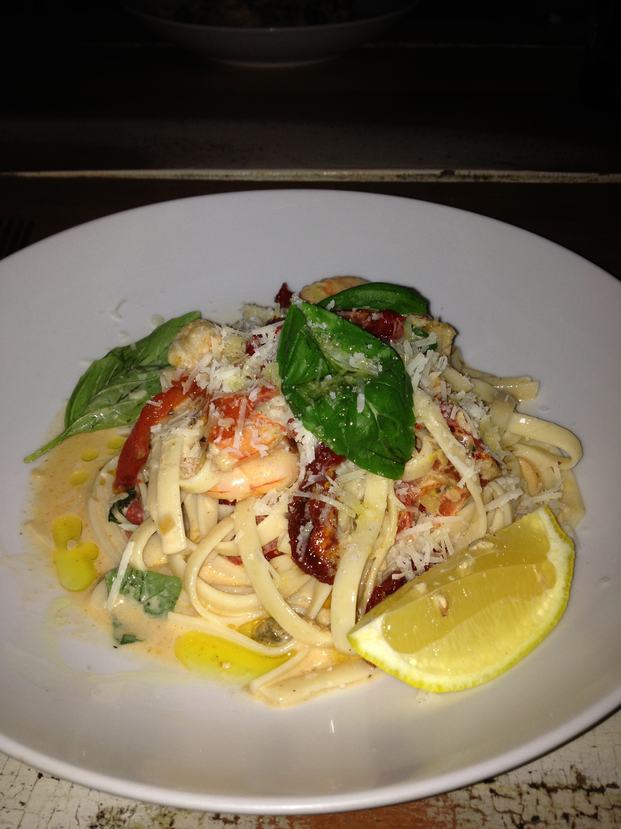“Mazza” in crème sauce with semi-dried tomatoes and char grilled capsicum (dedicated to Jim and the fun times we used to have. He’s not dead, just married.) Half a dozen marron, big ones 200g packet of fettucine A big ass red onion Lots of garlic A cask of white wine 500ml thickened cream A jar of semi sun dried tomatoes 2 red capsicums Zest of a lemon, finely grated A bunch of basil Handfuls of baby spinach Pine nuts, toasted Finely grated pecorino, basil leaves and lemon wedges to serve