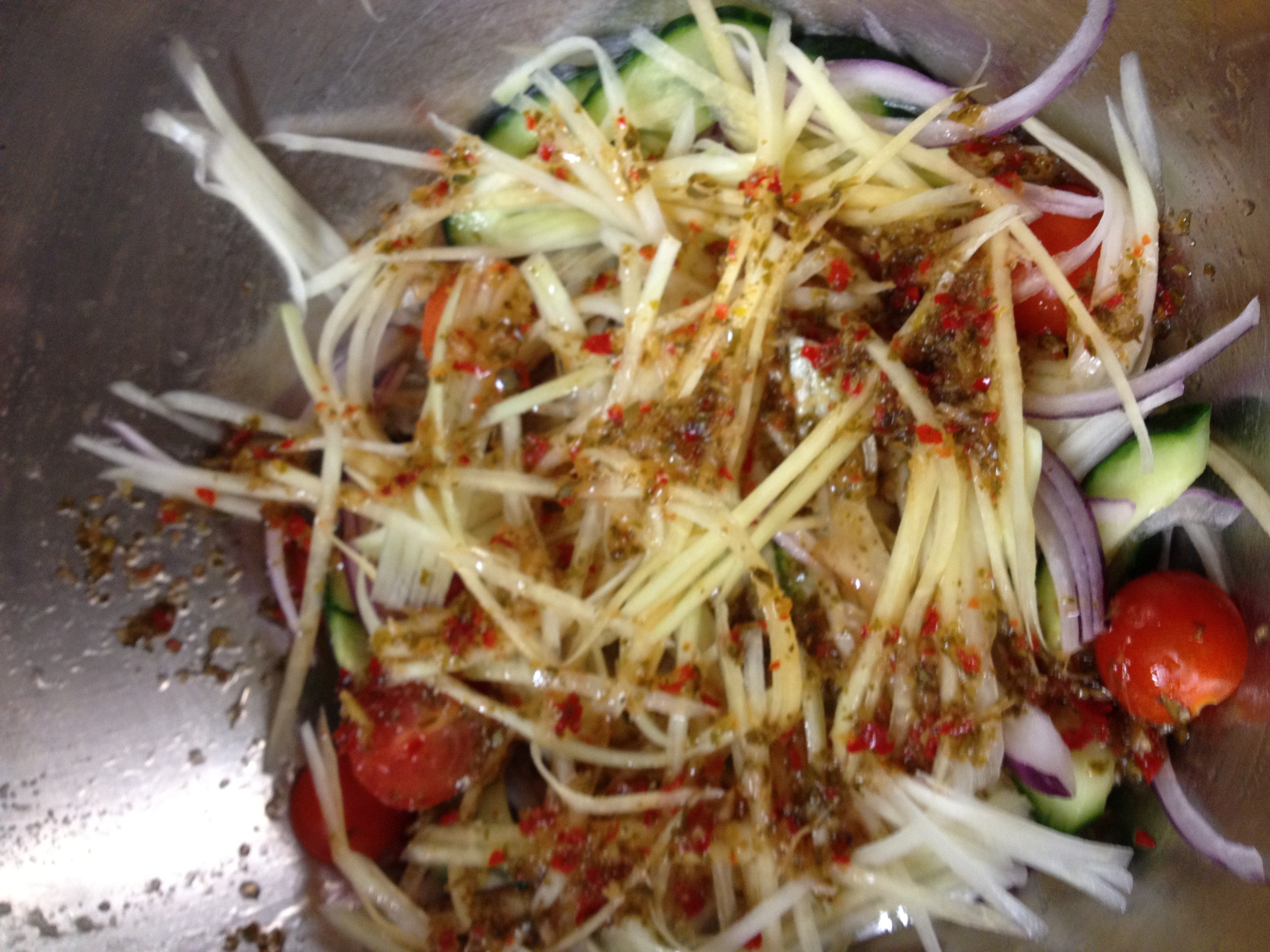 There’s a recipe for nam jim two posts back and I mentioned that it does go jolly well on the old green papaya salad. So now here’s the green papaya salad recipe so your nam jim doesn’t have to sit there all alone and scared by itself…