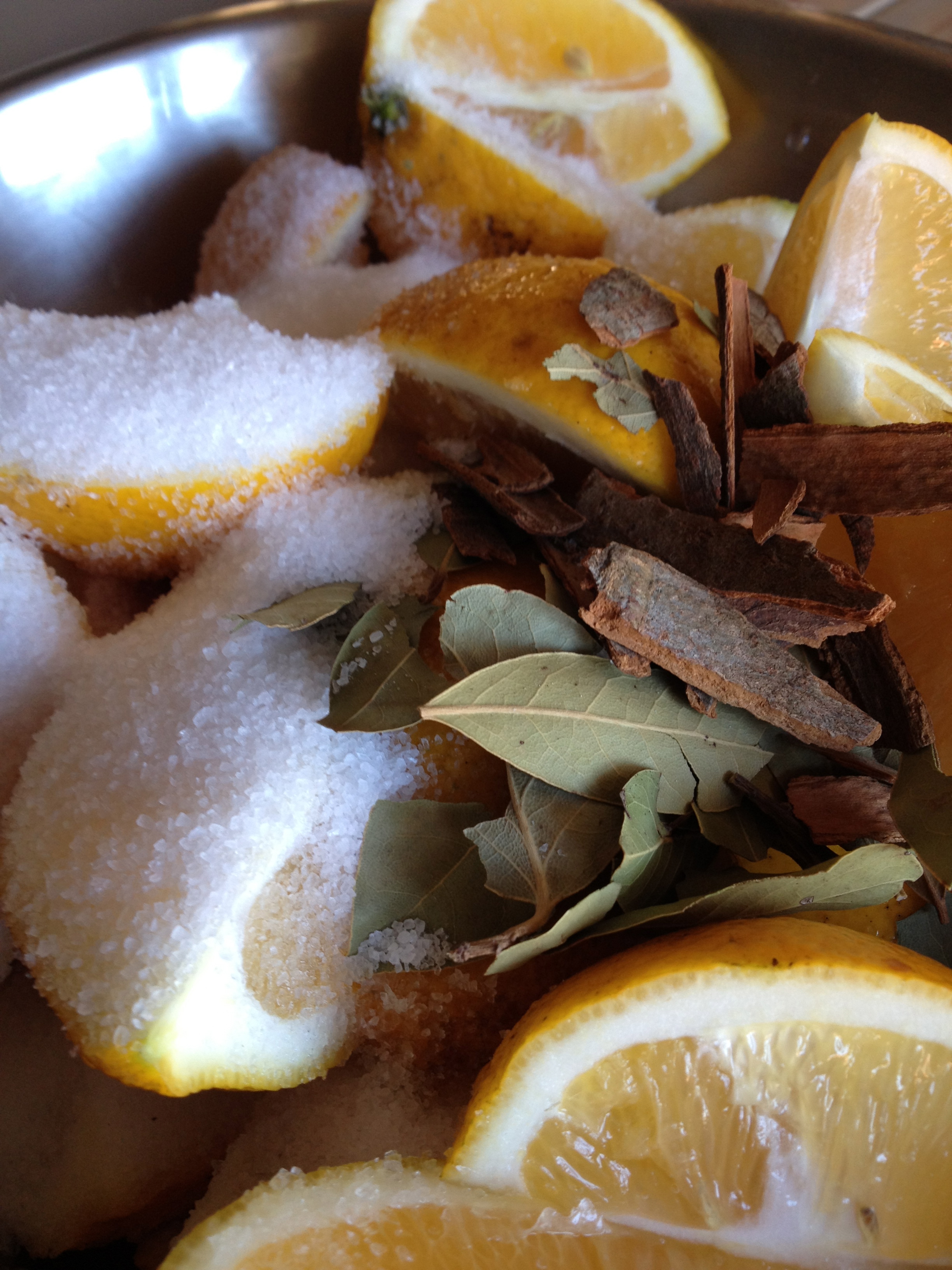 1. For every lemon you need a handful of coarse salt, ½ a cinnamon stick (I didn’t have one lurking on my spice shelf so I used cassia bark** instead) and 1 small bay leaf