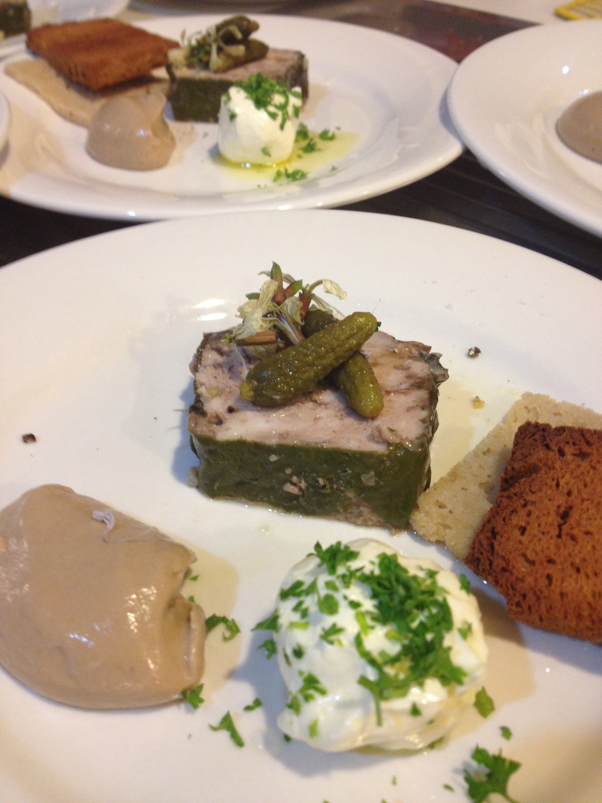 Pork terrine, chicken liver pate, herby labne, croute. That was the entree.