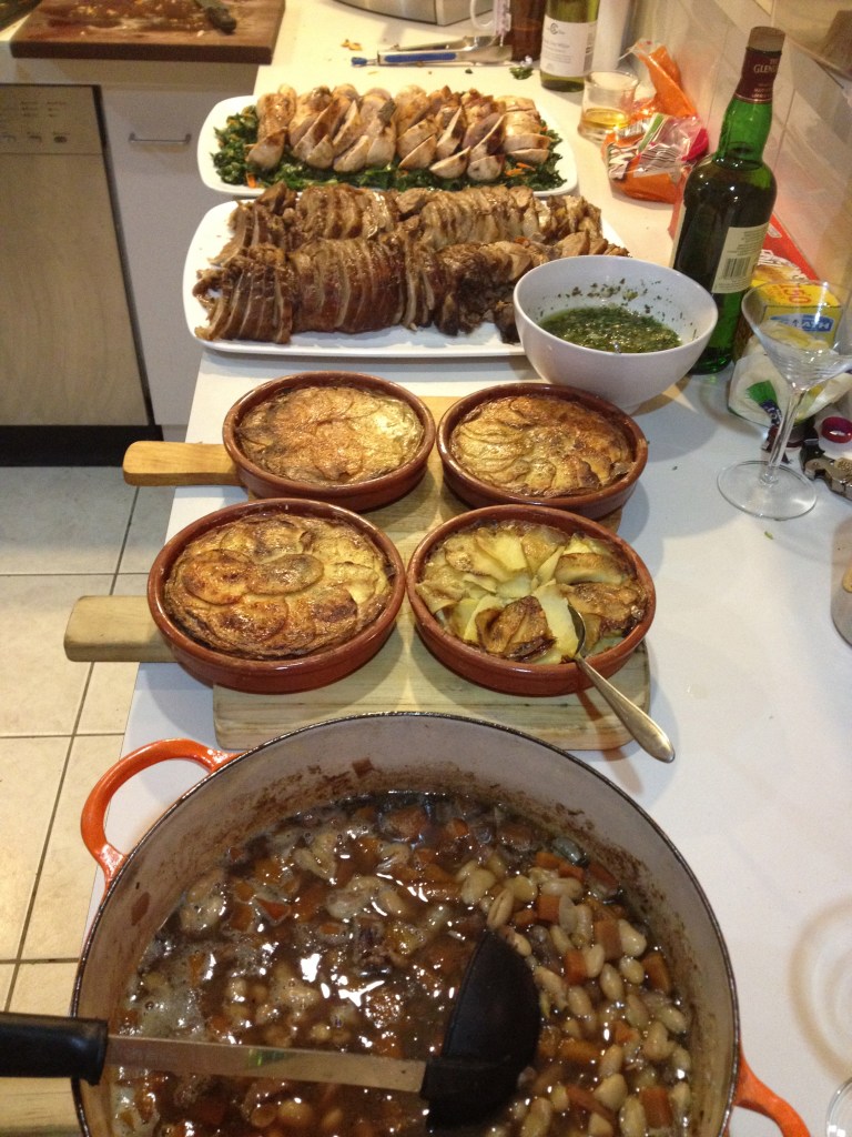 Braised beans with port, dauphinoise potatoes, 6hr lamb shoulder with caper and anchovy salsa, chicken roulade stuffed with good shit, buerre blanc
