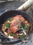 This night we decided it would be leg of lamb in the camp oven, with cannellini beans, tomatoes, olives, anchovies (you guessed it) and herbs.