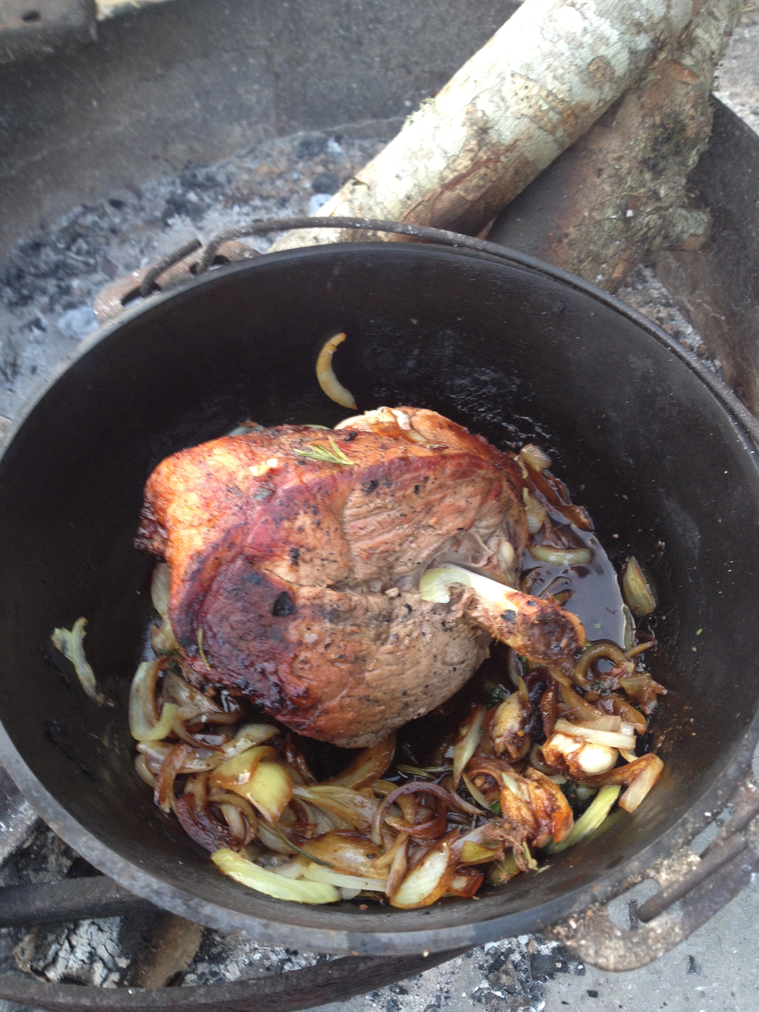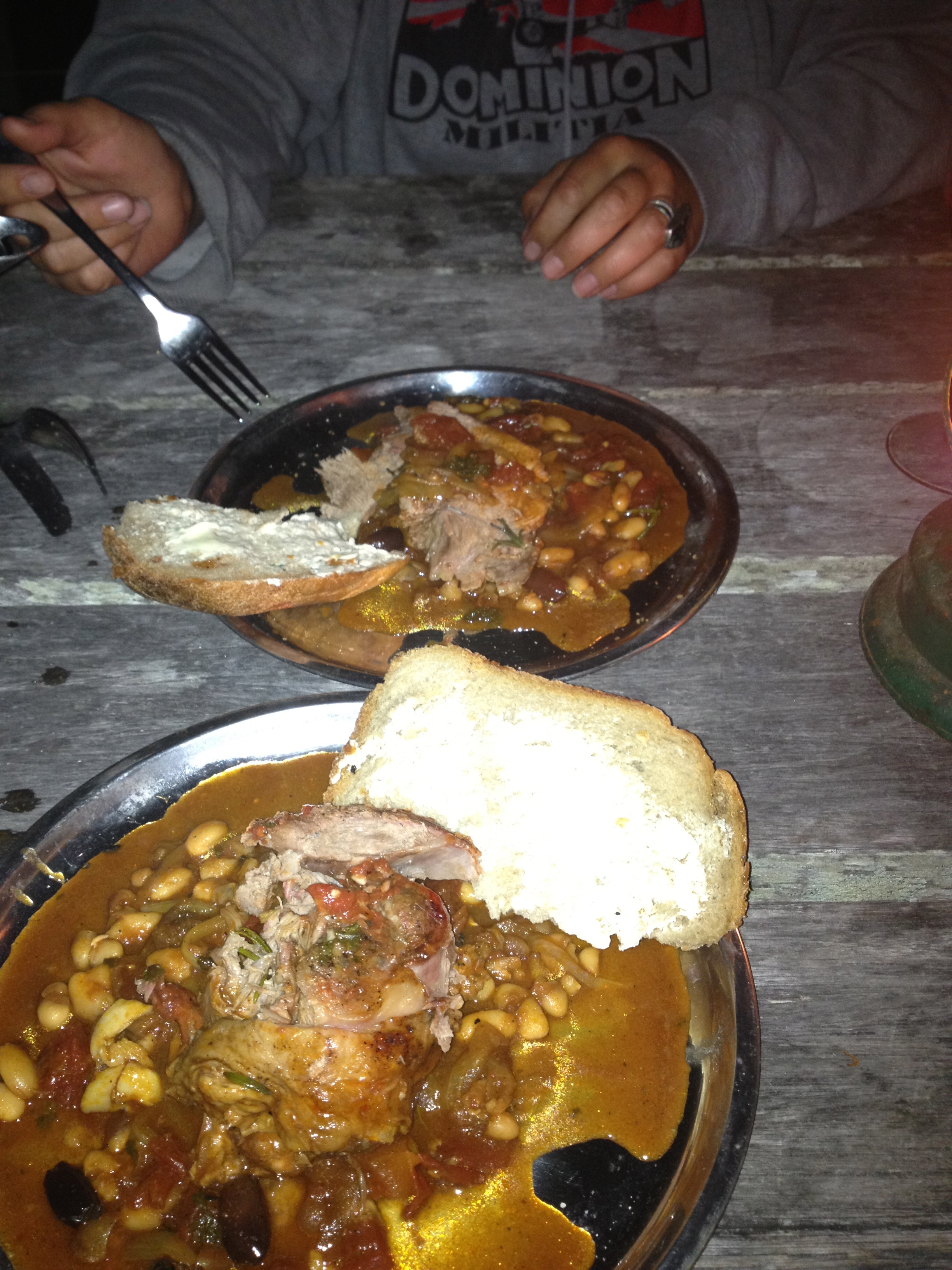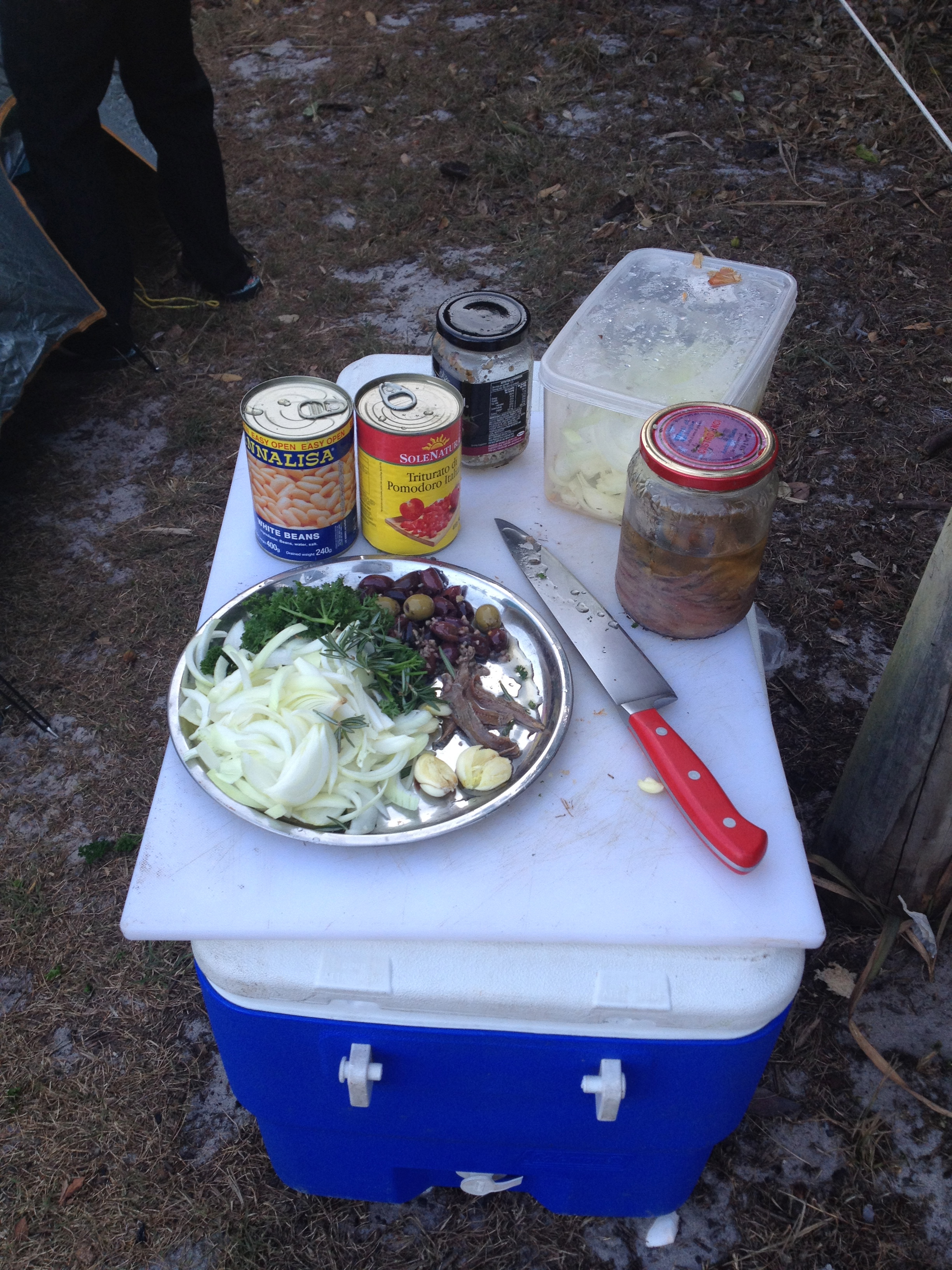 This night we decided it would be leg of lamb in the camp oven, with cannellini beans, tomatoes, olives, anchovies (you guessed it) and herbs.