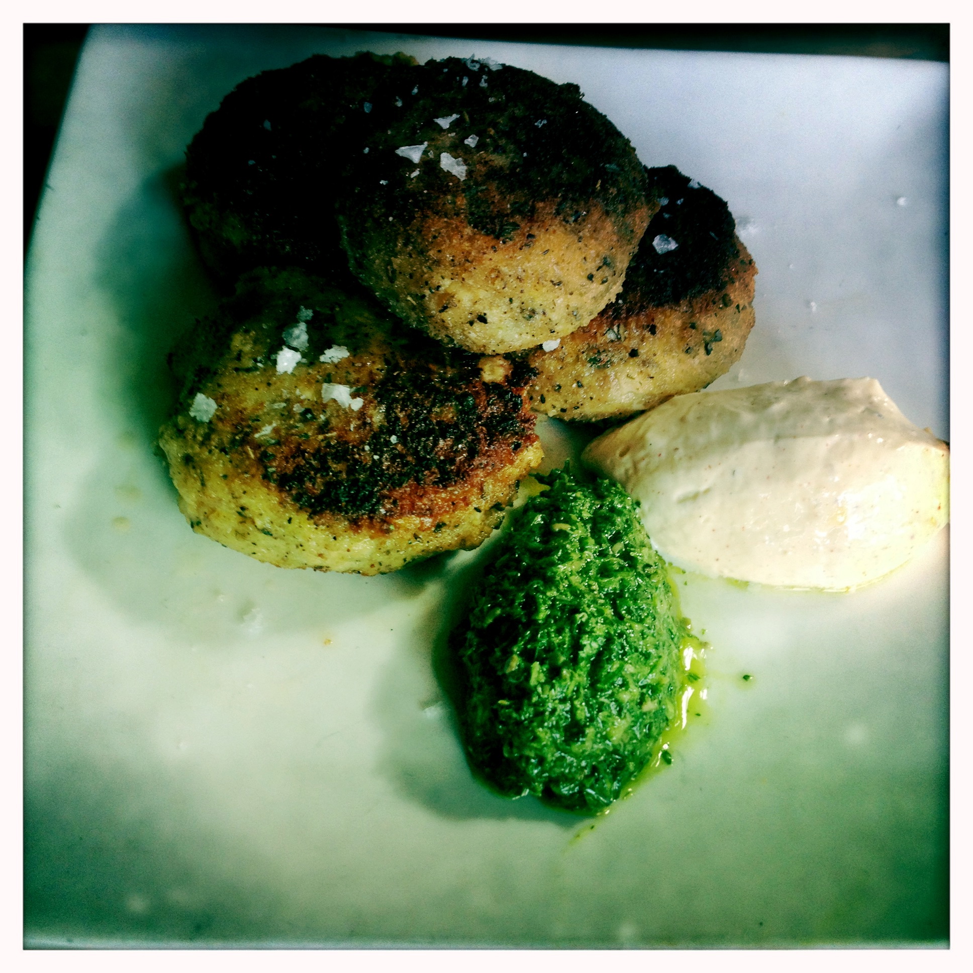 FRIED POLENTA AND PORK BALLS, PARSLEY SALSA VERDE, PAPRIKA MAYONNAISE