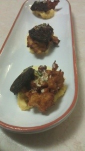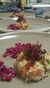 I offered up Atlantic salmon tartare with mixed grains, avocado, goats feta, truffle pearls and crisp beetroot, beetroot and jalepenos vinaigrette.