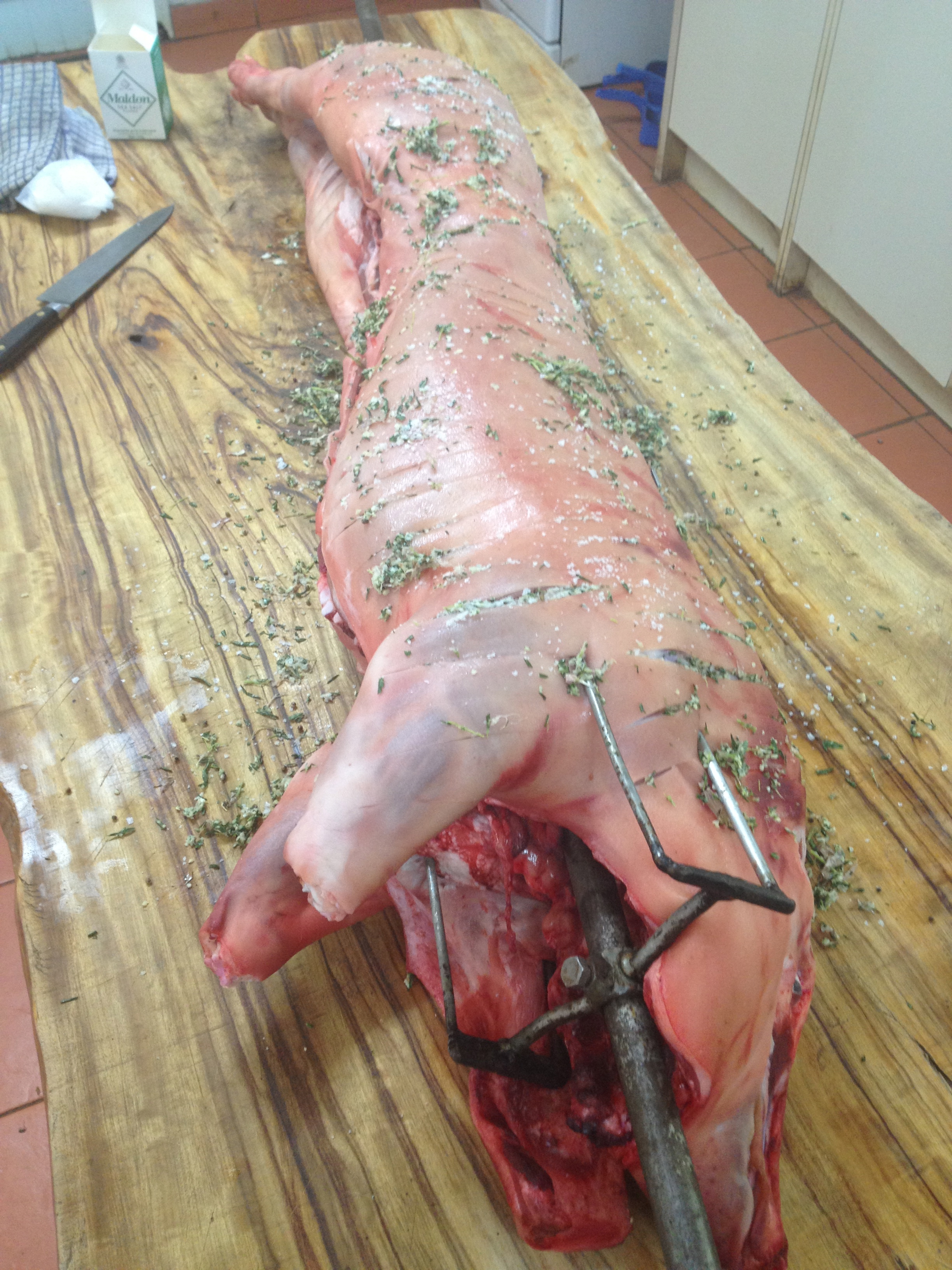The pig resting up before his big moment. Rubbed down with a heap of rosemary, thyme, garlic, salt and pepper all smashed up to make a piggy version of edible body soap…