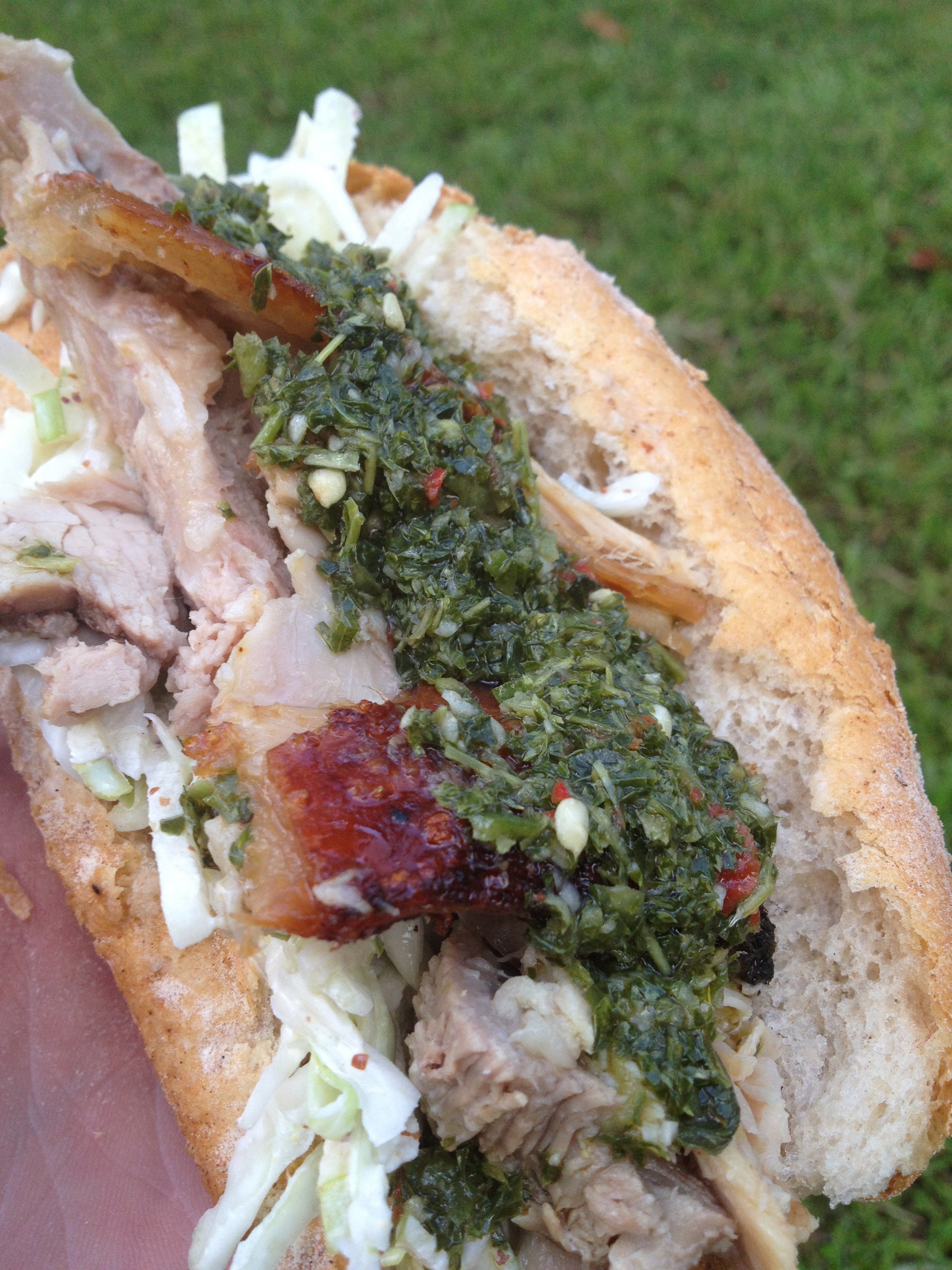 I ate my pork straight from every different part of the pig as Queenie and I carved it for the masses, which I do declare is a bloody fine way to consume our porcine friend. Also, just to keep the social aspect going on, I had some in a roll with apple and fennel slaw, and chimmichurri sauce. Dericious. There was also plenty of other good shit to eat, but it was a porky dinner for me this day.