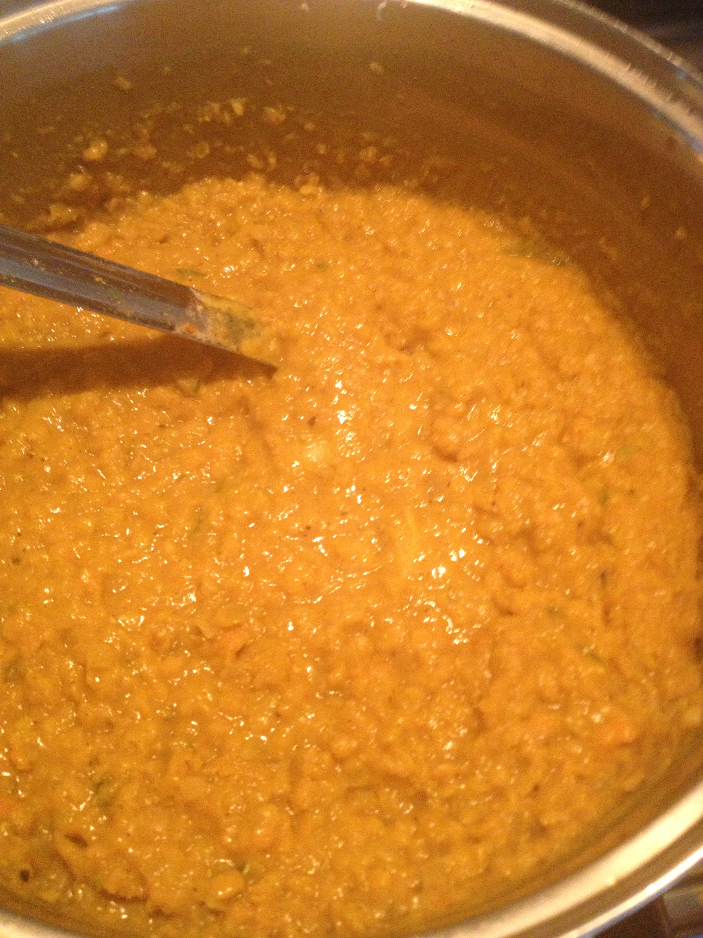 • cook lentils with cinamon, bay, ginger and 3-4 cups of water until soft and mushy. Discard spices
