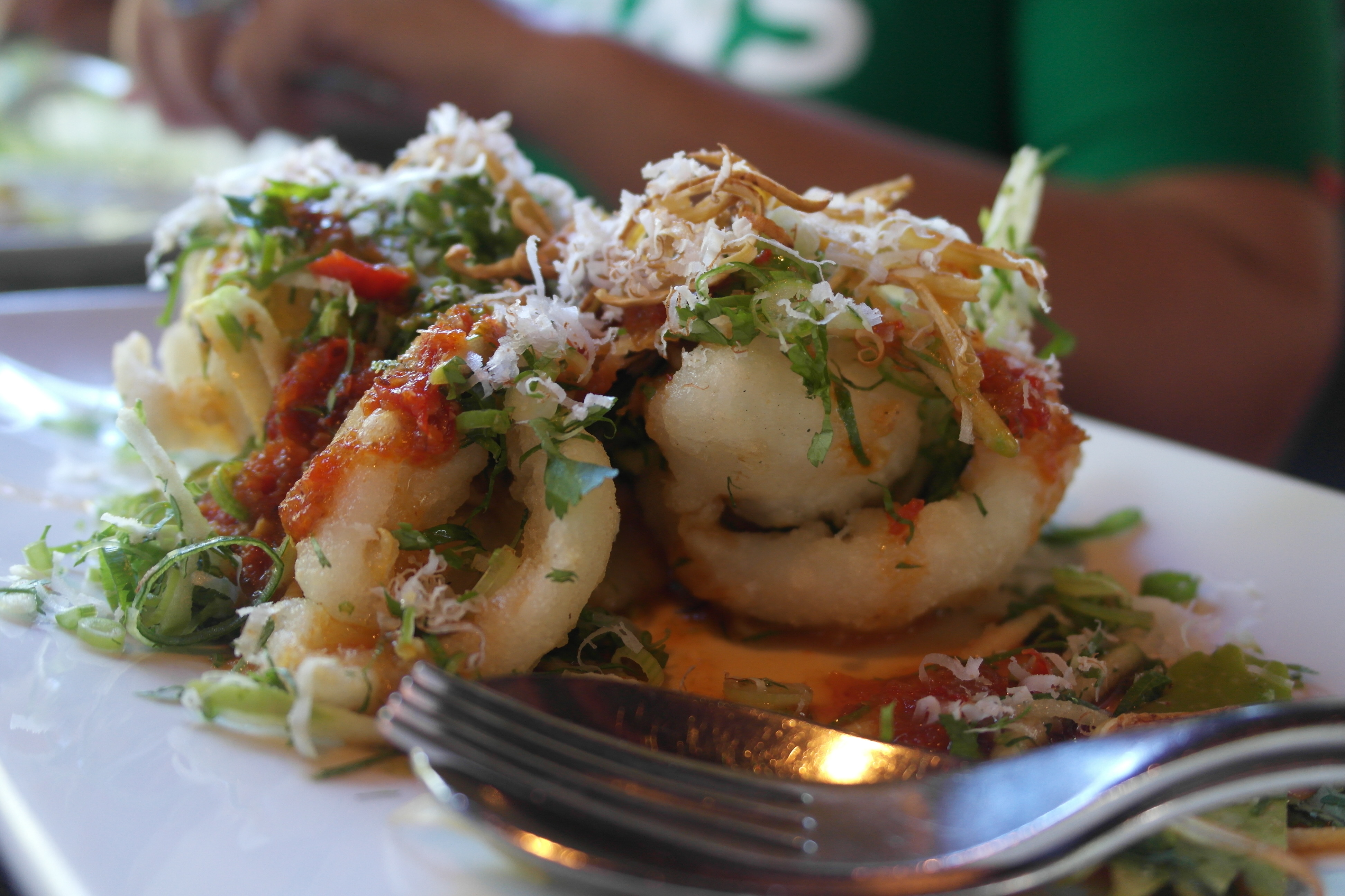 The cuttlefish. Aaaah the cuttlefish. It’s not something you see heaps on restaurant menus but I’m not sure why… it’s available by the cuttlefish scoop load where I’m from, but that may not be the case in other towns, like Mount Isa. Maybe people are scared of eating it or chefs scared of cooking it. Whatever. I love it and this was a fine cuttlefish dish indeed. Damn fine. Really, really fine. I FUCKING LOVED IT. Crisp cuttlefish, chilli jam, papaya, ginger, other awesome bits… this is my kind of Asian food. This and young Thai lady boys, but I guess they may not be absolutely correctly described as food…