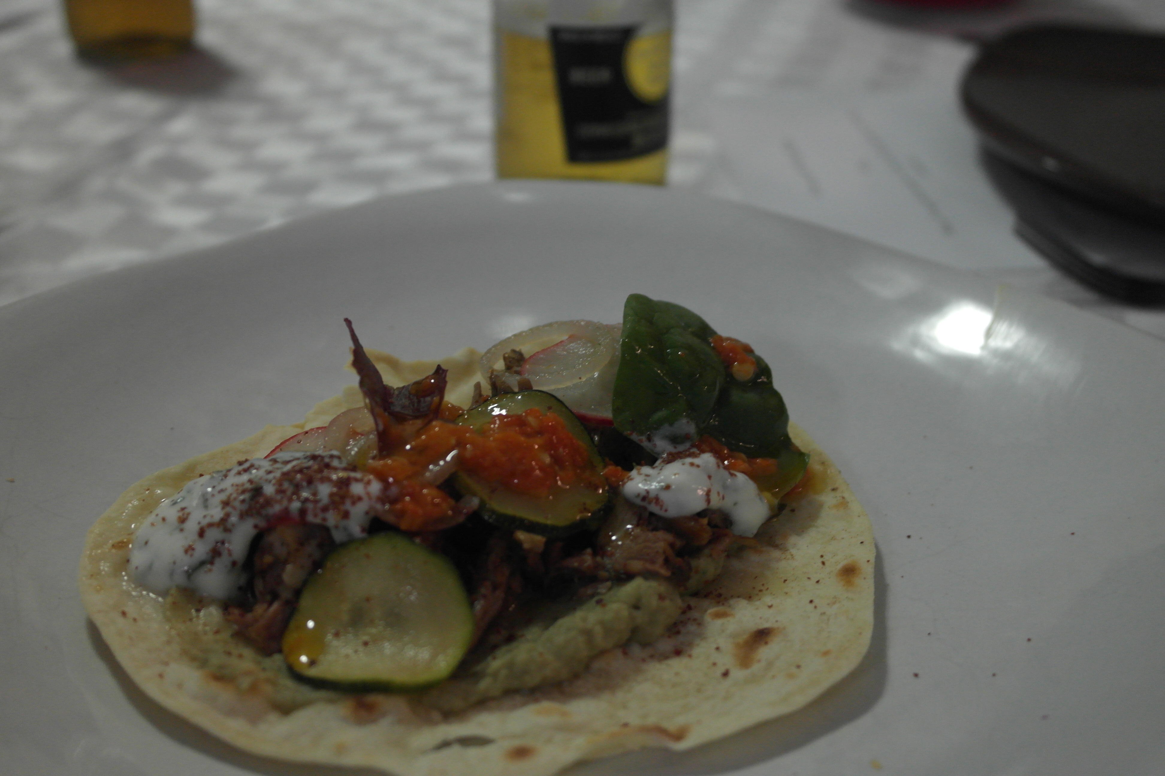 “Late night lamb sandwich”, slow roasted lamb, handmade flat bread, eggplant puree, pickled zucchini & radish, herb yoghurt (Intruders)