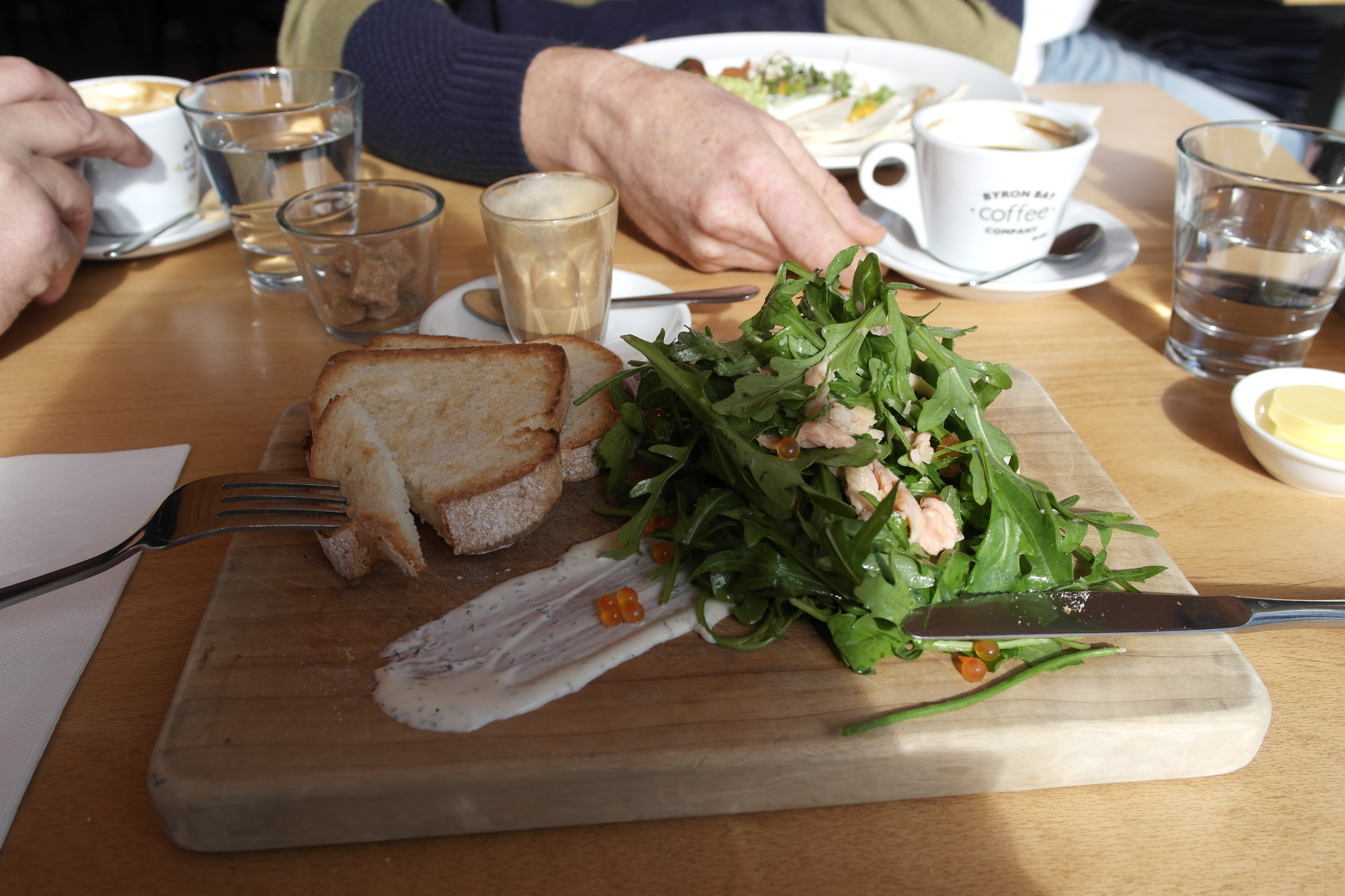 Smoked trout salad goodness and cracking Byron Bay Coffee
