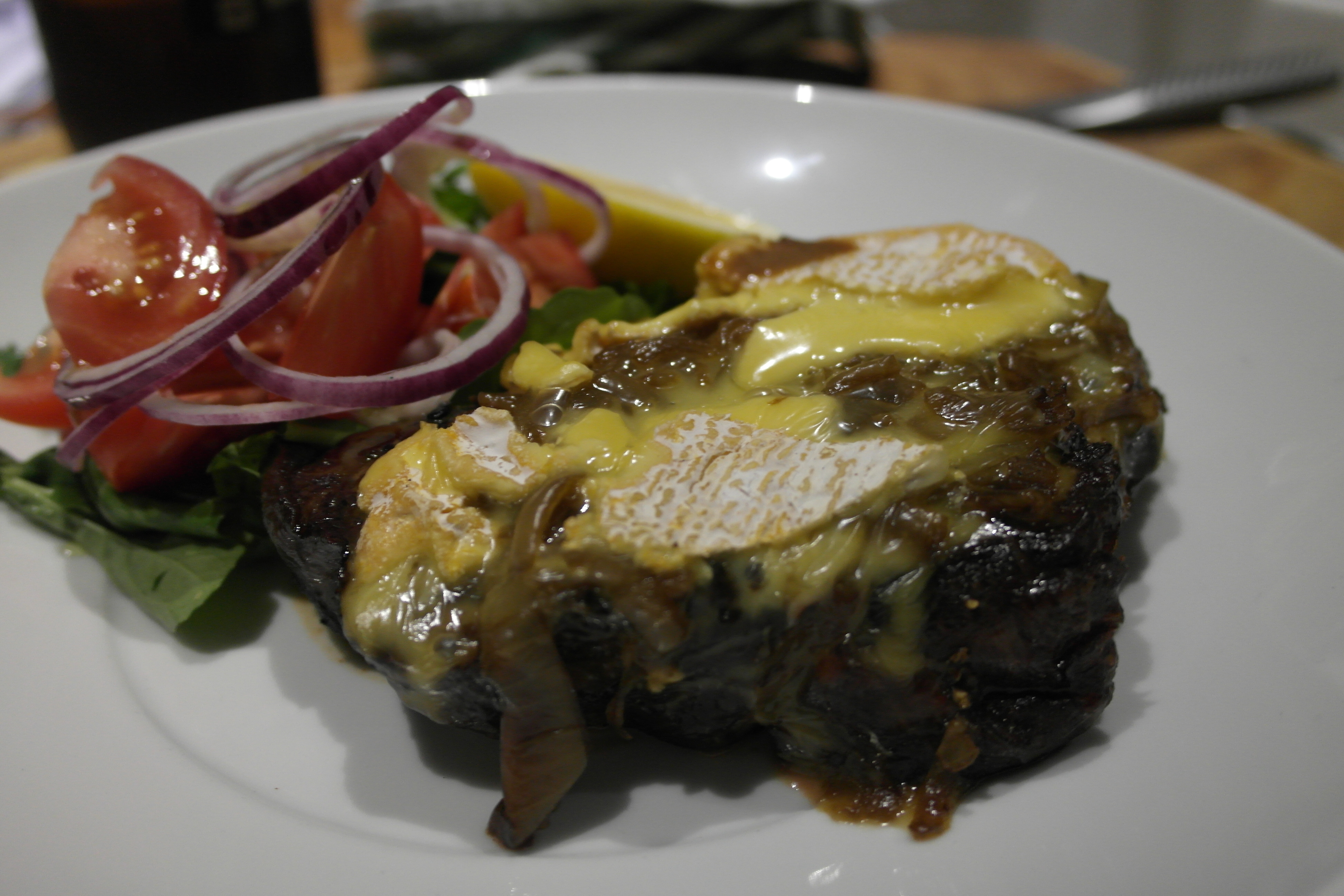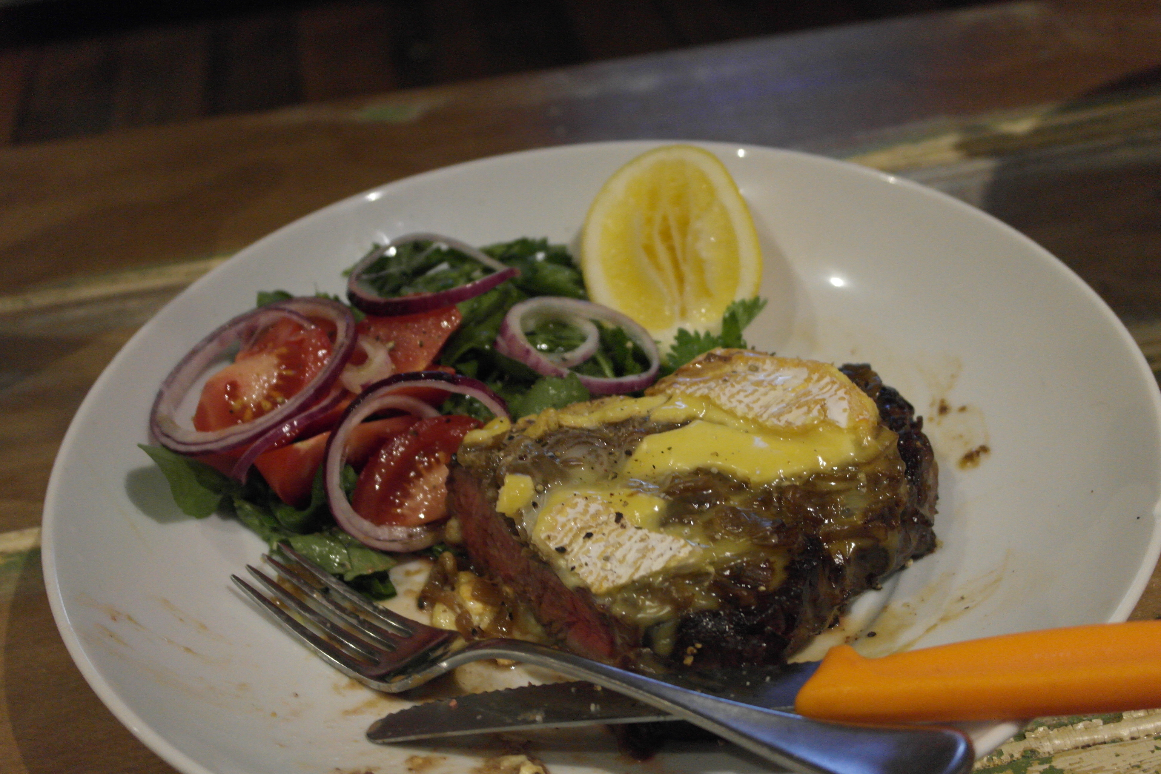 Rib eye steak with onion jam and washed rind cheese is easy, yet a little bit classy, much like the up town girl who’s had one to many Dom Perignons’. It tastes damn fine (still baring similarity to the up town girl) and all it needs is a little salad on the side. No! don’t go putting duck fat kipfler potatoes or pommes boulangerie with this one. You will have an actual heart attack if you do that. A simple salad with some peppery notes, a little bit of sharpness and a load of cheffy wank. It is that easy! And don’t be afraid to use this recipe to jazz up your next steak sandwich – maybe with a bit of fennel ‘slaw (just for Pauly) and home made bbq sauce…