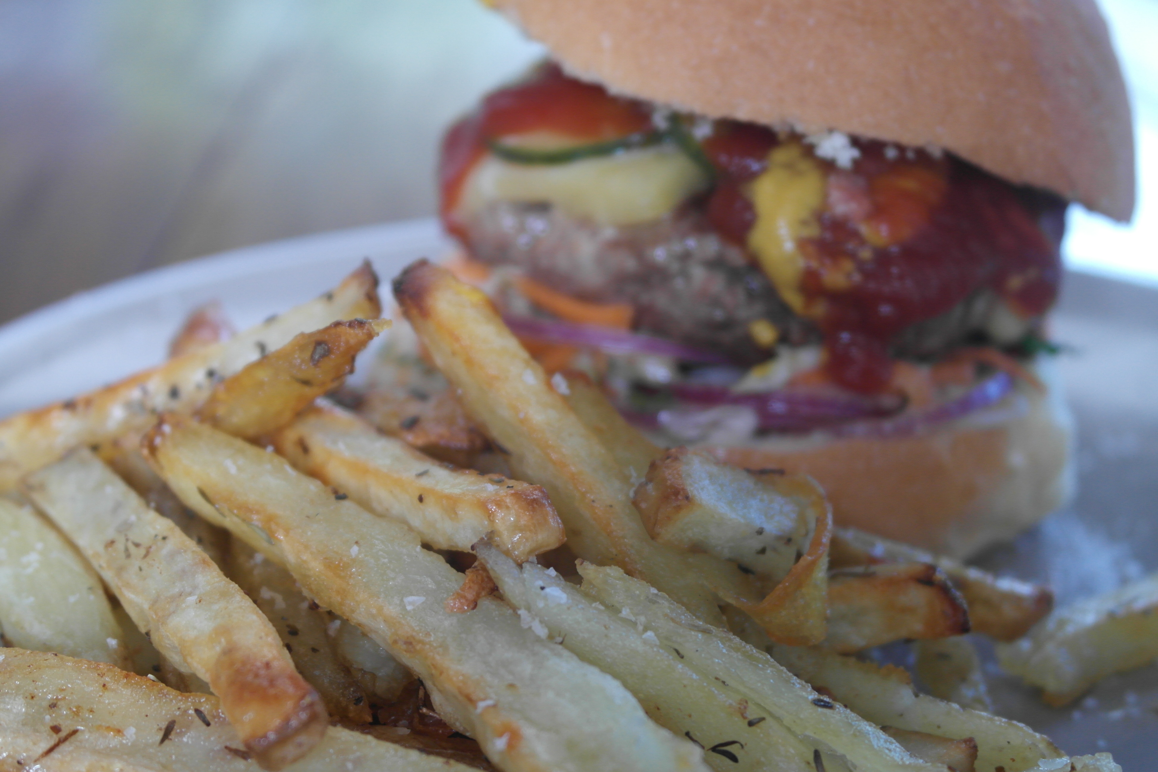 I saw only one way to get through; I really needed a burger. That, plus some herby oven fries were quite literally the only thing that would get me through the afternoon and place me comfortably into the arms of the sandman so I may dream a sweet sweet dream and awake to discover that my brain had been returned to me. This is what I did.