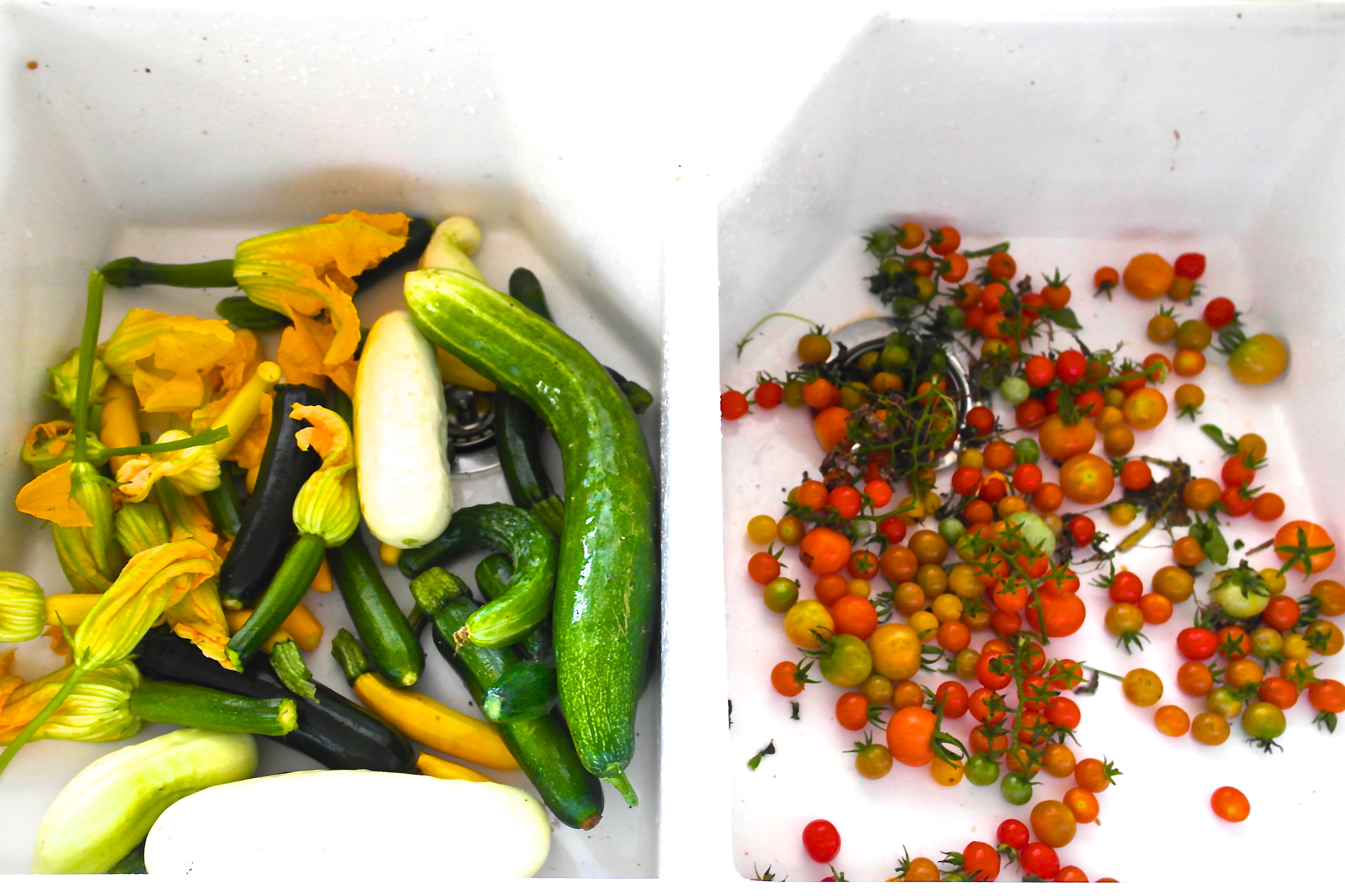 Our garden is being particularly nice to us at the moment. Not nice like helping out with the washing, or dropping the kids at school, or watering our pet carnies, but nice in a way that only a garden can; by producing an abundance of fresh vegetables that we get to use in our meals every day of the week. And what we can’t use now we will pickle or preserve for the impending apocalypse (I’m sure I will offer a recipe or two for those pickles and preserves later), but today… today, using my brand new “Vegetable Pick-o-matic 2013” aka. My hand (known for many other purposes I might add… none of which shall be shared with you today. But I’m sure you can guess… Nudge, nudge. Wink, wink), I have harvested a heap of baby zucchini with their flowers, a load of cherry tomatoes and a handful of fresh herbs. Times are tough when you’re going to be eating fried zucchini flowers stuffed with olive and feta mousse with cherry tomato and herb salsa. Very tough indeed…