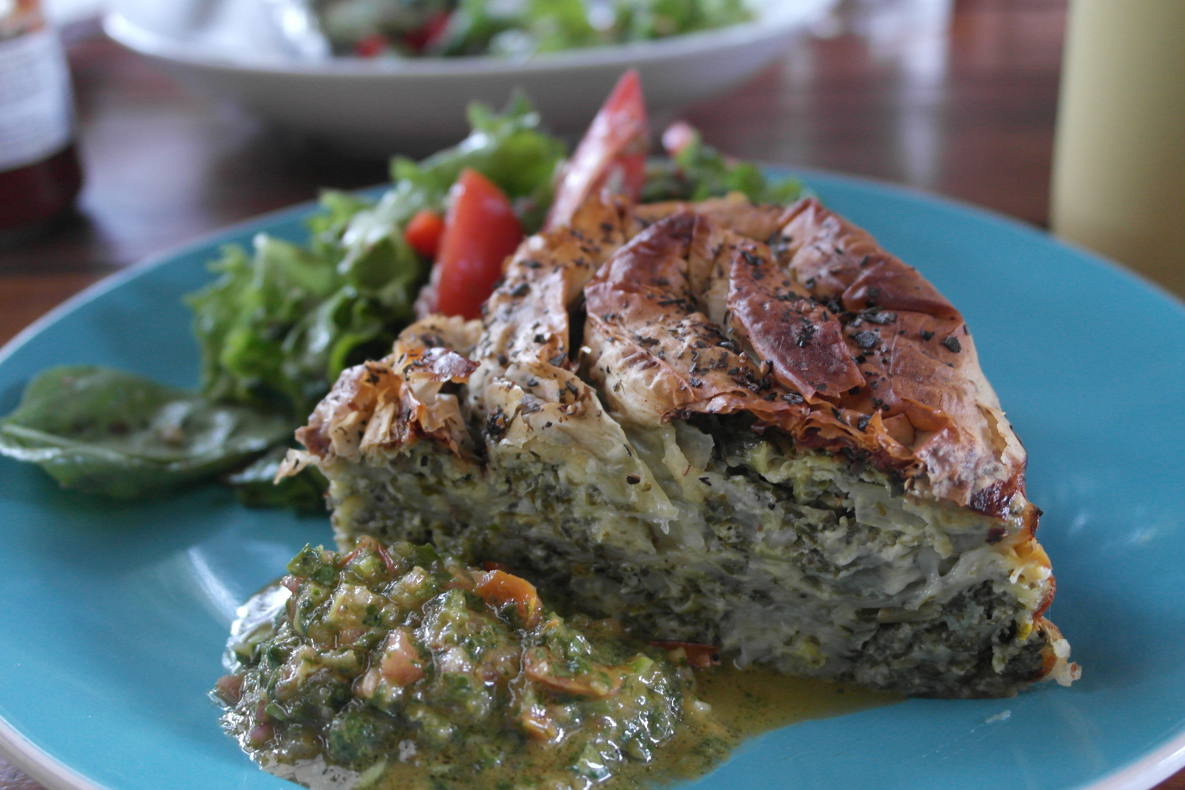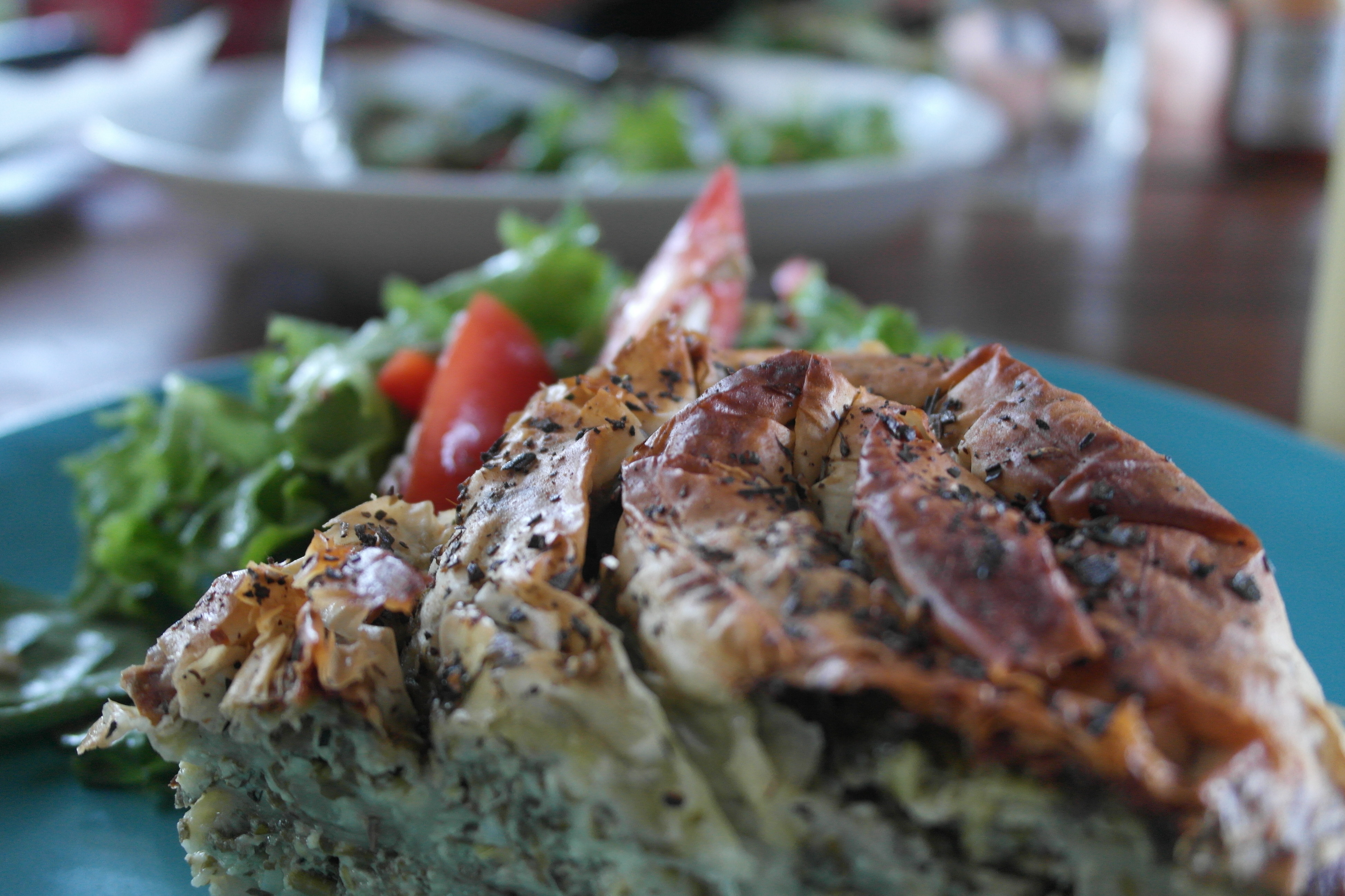 Spanakopita is some kind of Greek pie. It is rolled in filo pastry with a spinach-y cheesey filling. Basically it is kick-ass. A pie that has kept many a 70-something-year-old Greek man boned up and ready to go (and yes, that means what you think it means). I’m pretty sure my friend Helen over at Pantry Obsession will be commenting with a few actual facts about this magical pie so for now I think it is pretty safe for me to report what I think I know (aka. The facts). This stuff smells really good in the oven… heaps better then it would sitting in a carnies loot bag for three days in sideshow alley. The smells made me hungry. I was just glad it was the job of my children to continuously ask the fine woman who carried them in her womb and eventually pushed them into this world in one final… I’ll do you a favour and leave that one out for now. Needless to say, the boys were annoying the hell out of Jennee by continuously posing the question as to when dinner would be ready. Eventually the dinner was ready and we filled our bellies with this cracking spanakopita.