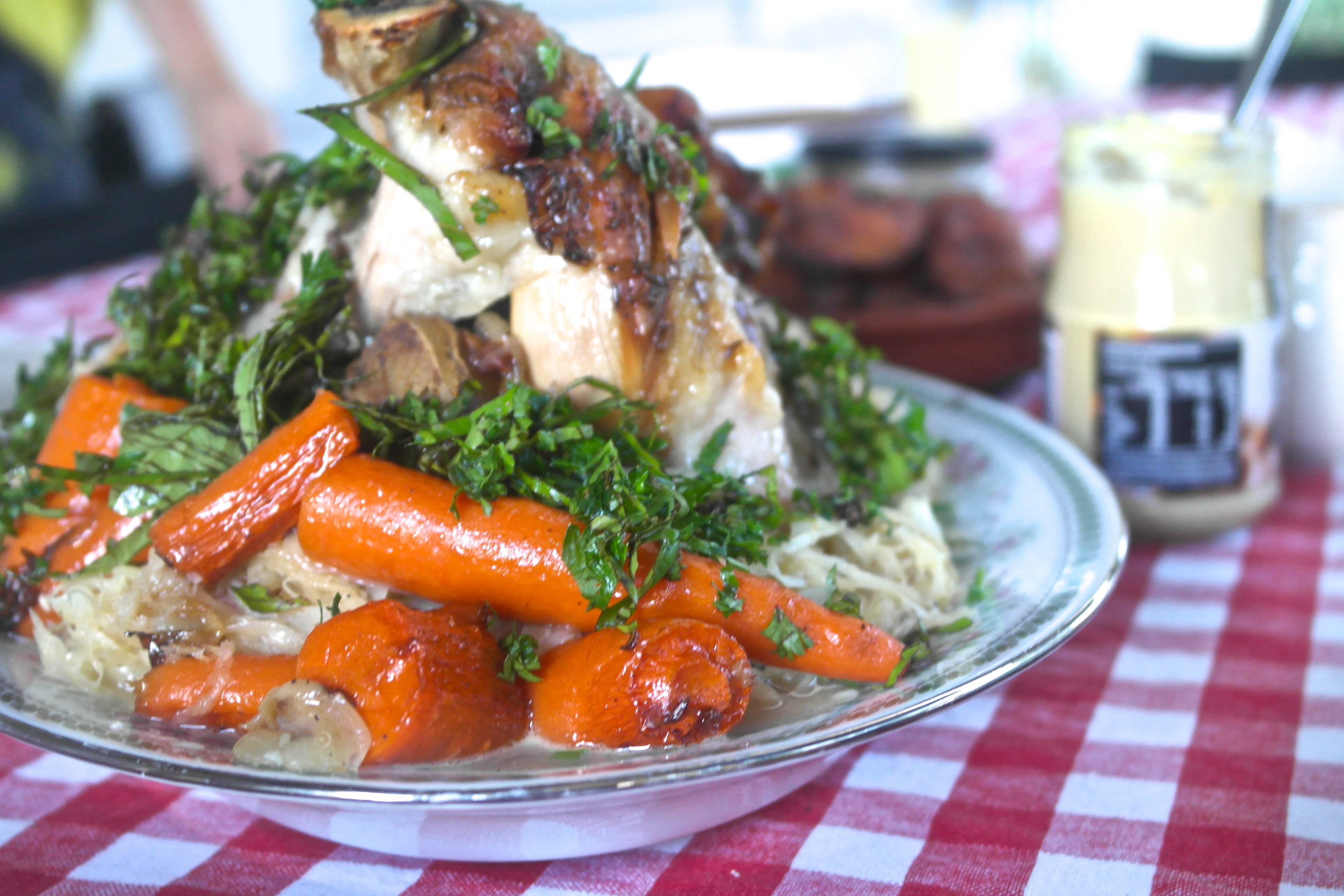 • Put the knuckle and carrots into a roasting pan and then into a 200C oven for 15 minutes to achieve their only goal in life – to be crispy and roasty and find their new home in your belly