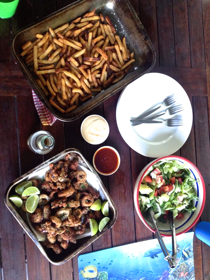 • Now fry your squid in batches of 10 or so (I would suggest doing this with a shirt on even if you are on holiday. Hot fat. Lesson learned) for 1 minute, turning regularly. They should be crisp and golden. If they are pale and soggy you should probably put them under your bed with those socks that look much the same…