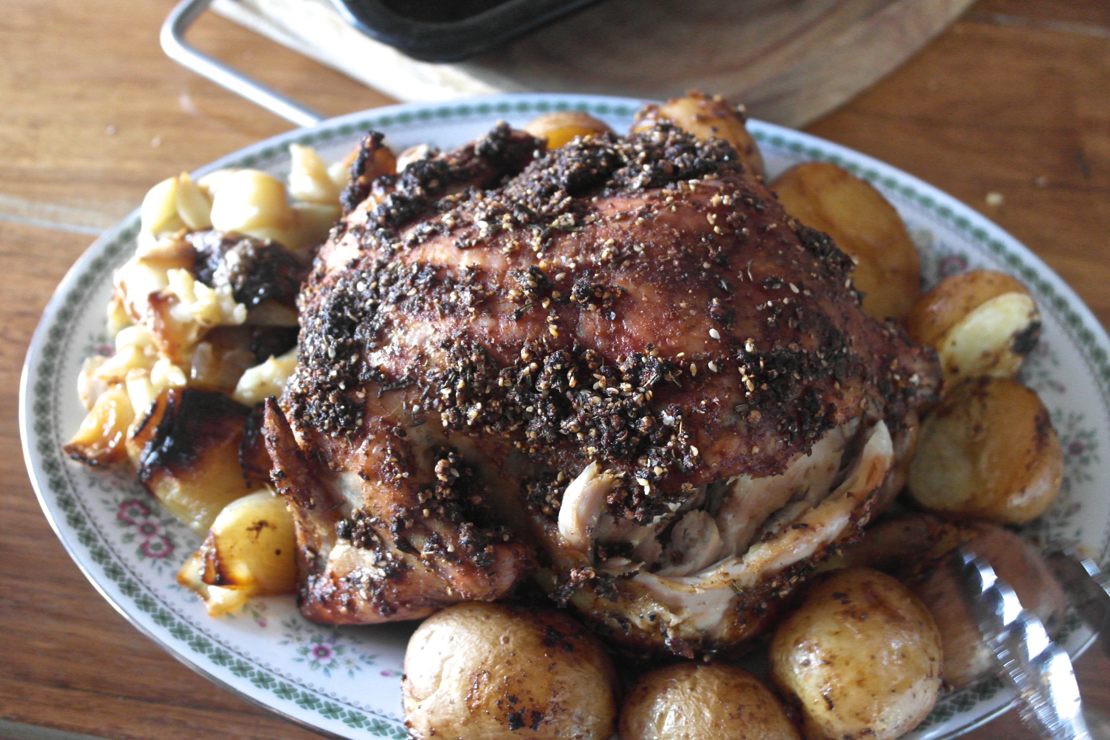 What? Sunday’s dinner and I’m just now hearing about it! I love roasted chicken and this rub does look like a good one. Love the whole garlic in the roasting pan too! Beauty of a dinner.