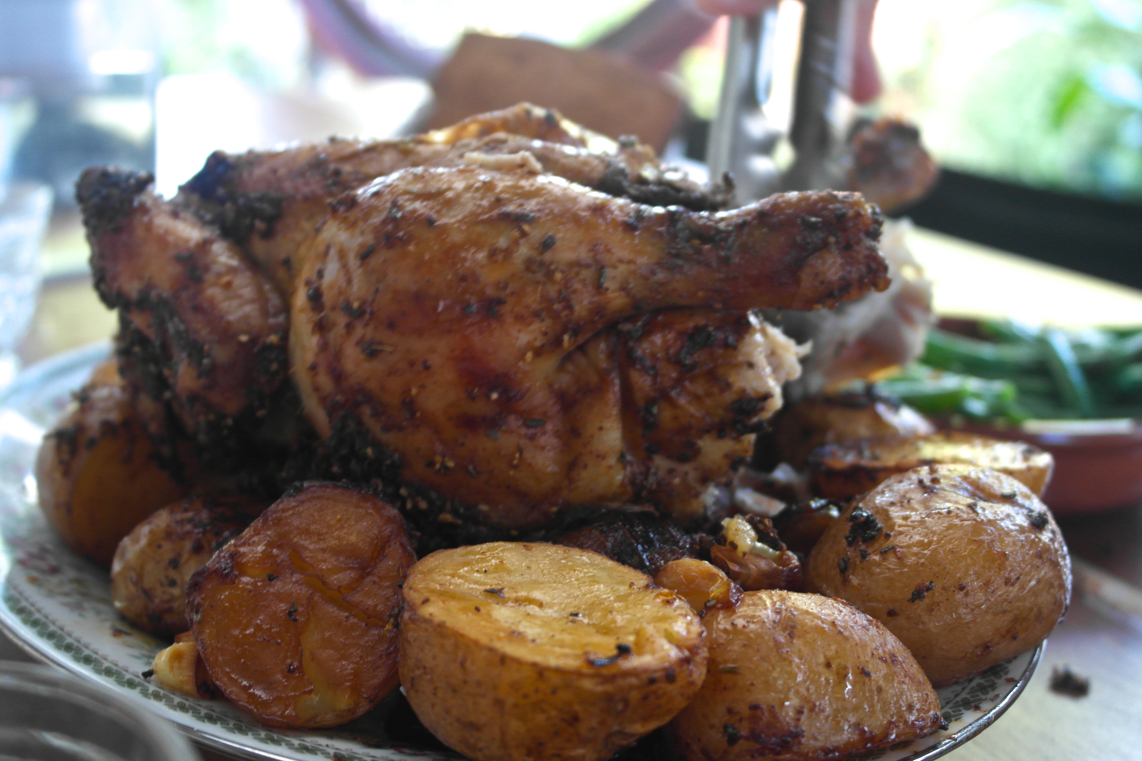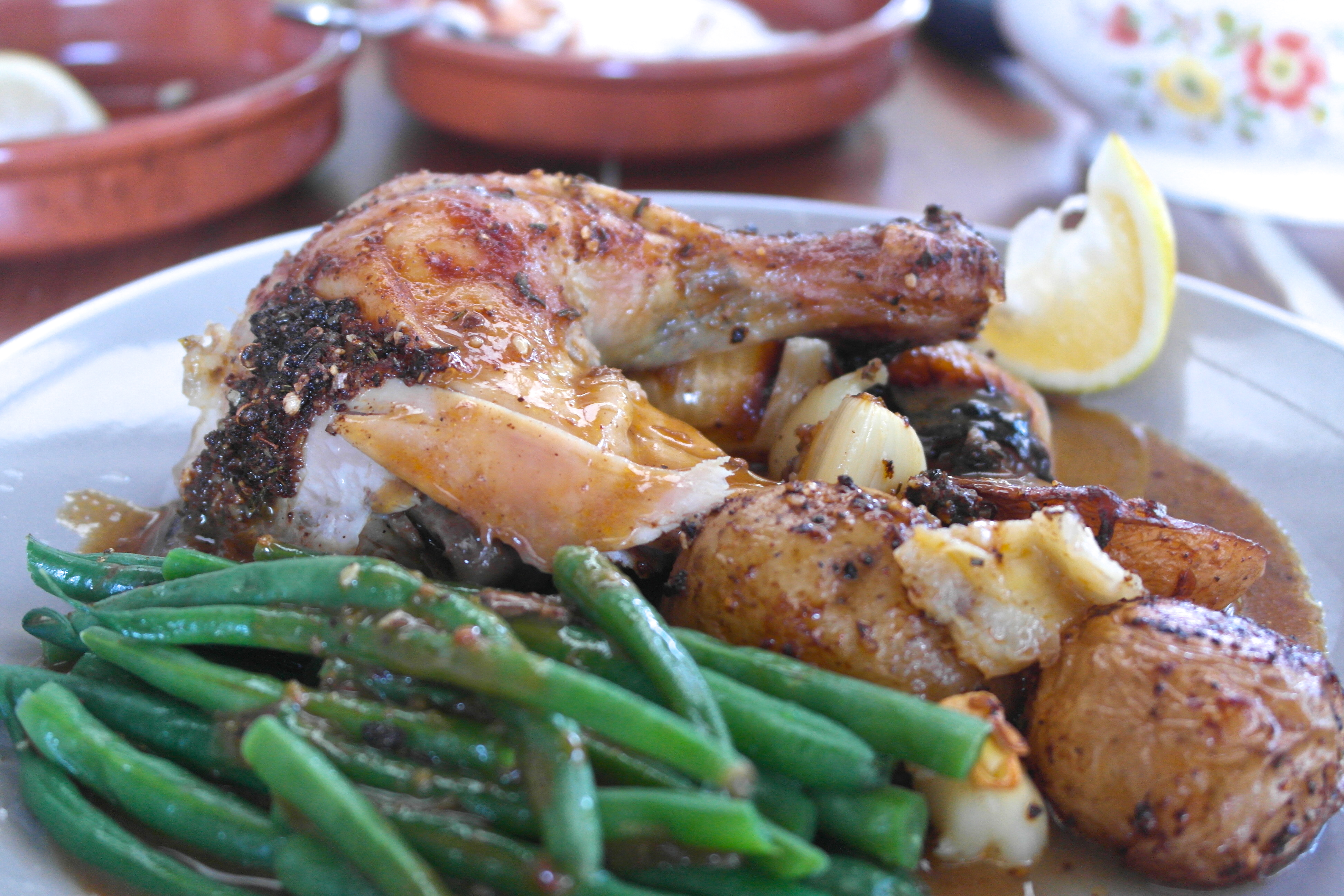 Back to the chicken; this was a damn fine bird. Jennee had rubbed it down with something that could only be described as “really tasty shit”. I think the “really tasty shit” was made up of dried oregano, rosemary, paprika, sesame seeds, peppercorns and preserved lemon… or something similar. Roasted potatoes, onion and garlic, steamed beans and a kick-ass pan gravy rounded it off very nicely.