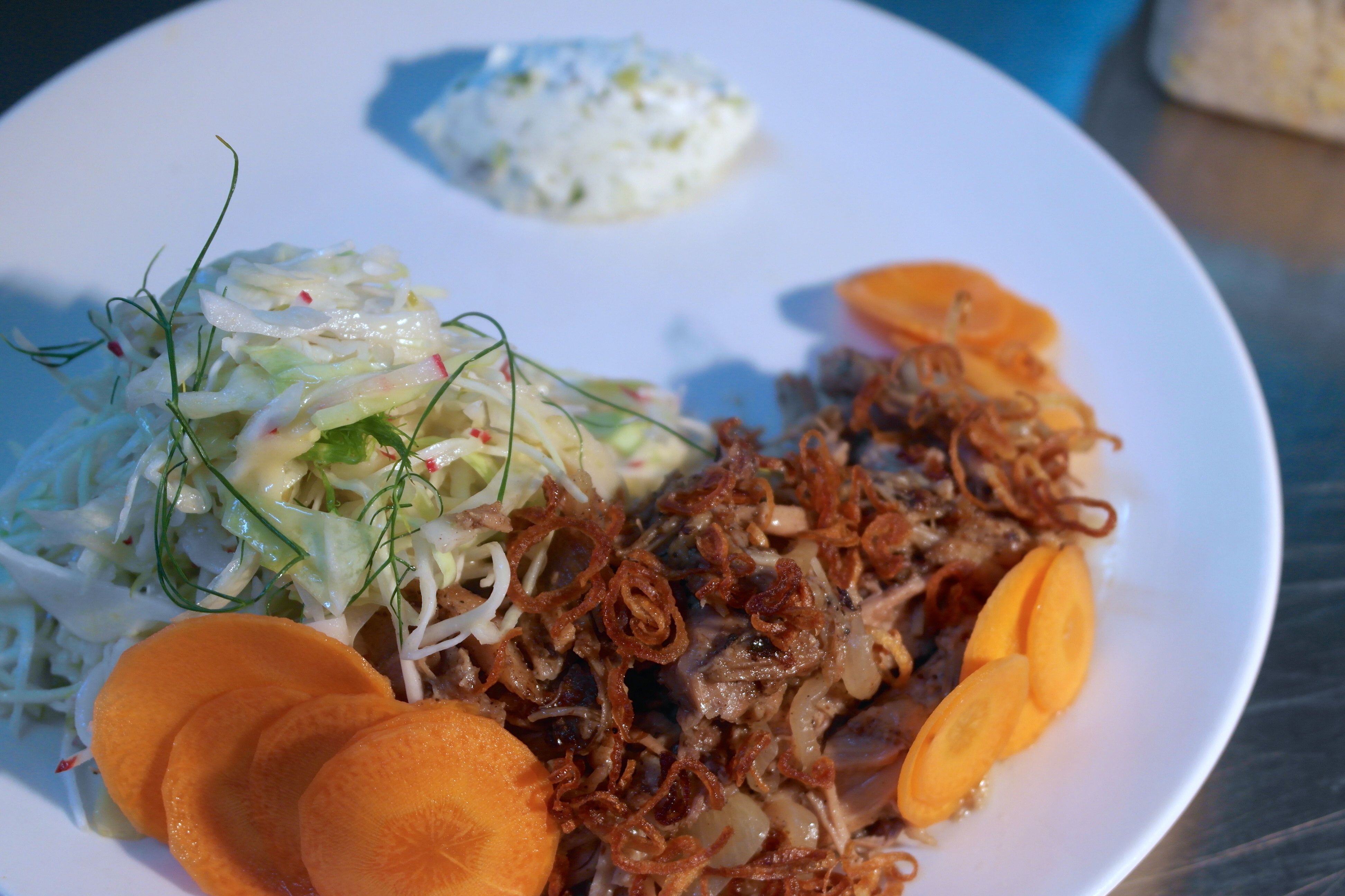 Pulled pork with jerk spices / apple, fennel and radish slaw / jalapeño yoghurt / pickled carrot (for 4-6 with left overs)