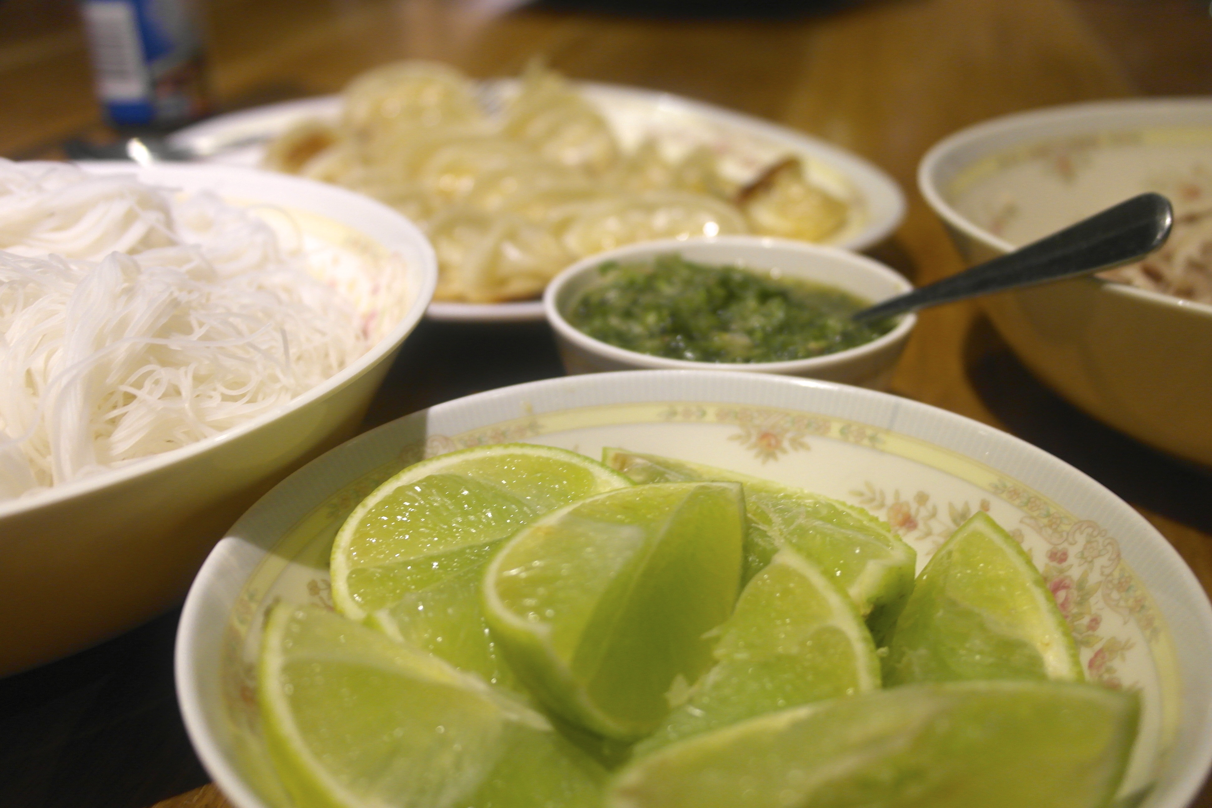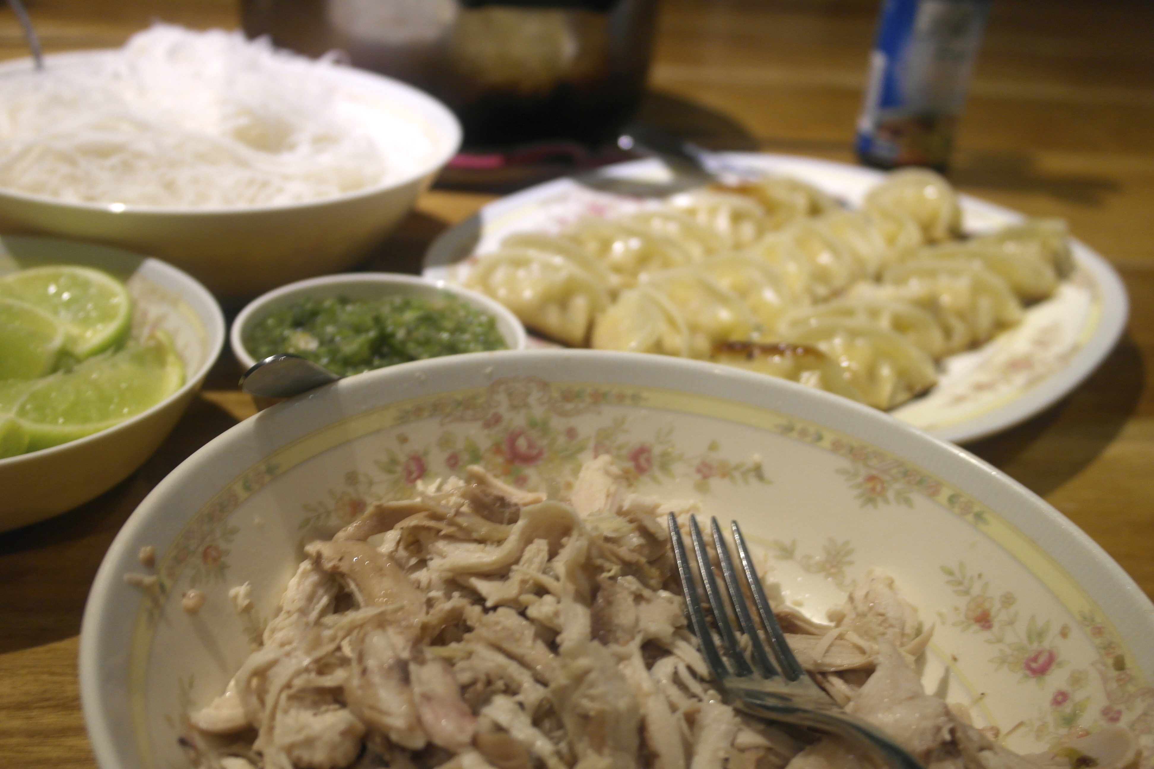 Chicken, coconut and kaffir lime broth, noodles and dumplings