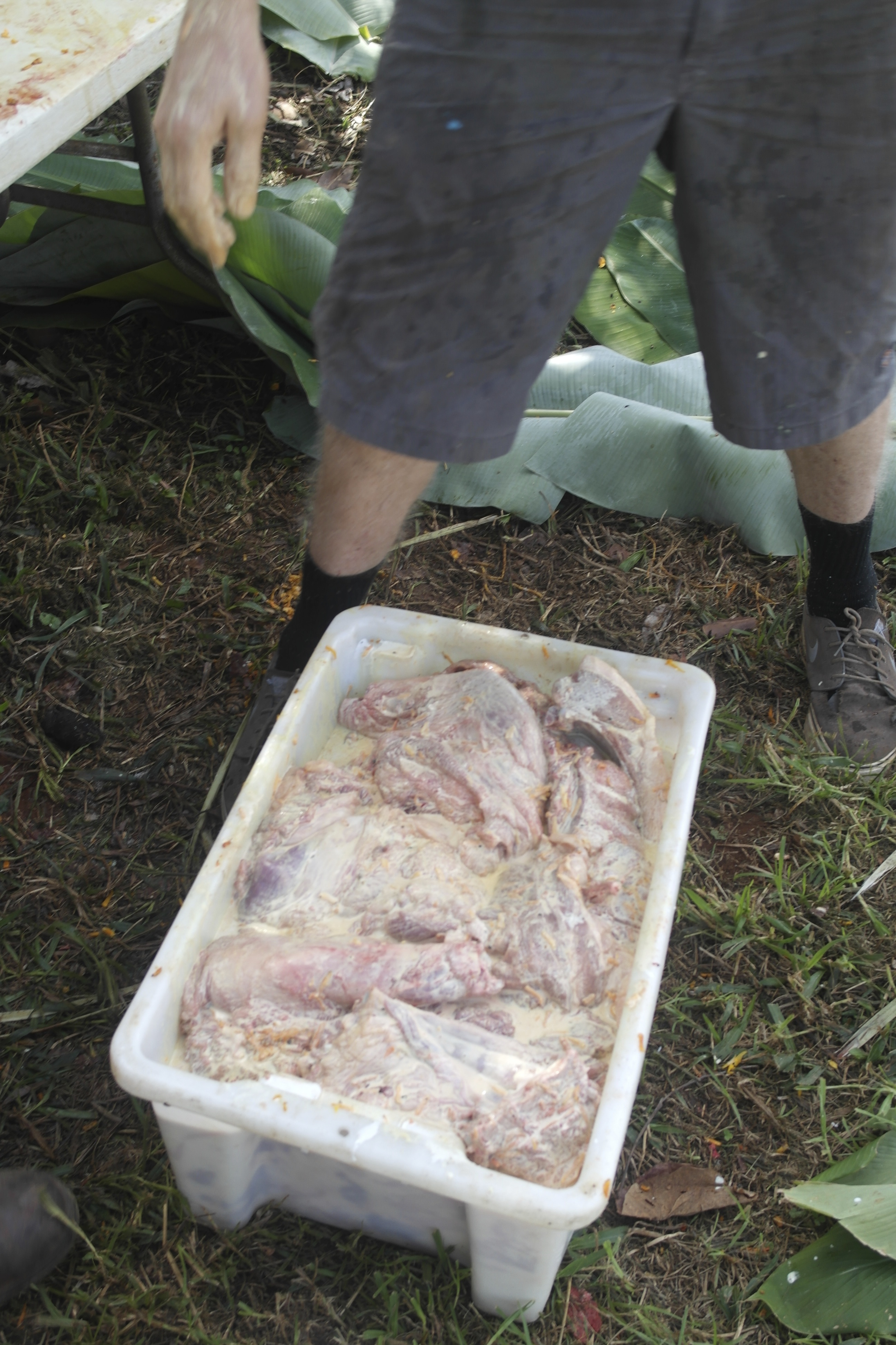 • Butchered the pig and marinated it in fresh tumeric, coconut and chilli. The marinated meat was then packaged into banana leaf parcels and then wrapped in alfoil for extra security… I’m a white man here. Give me a break