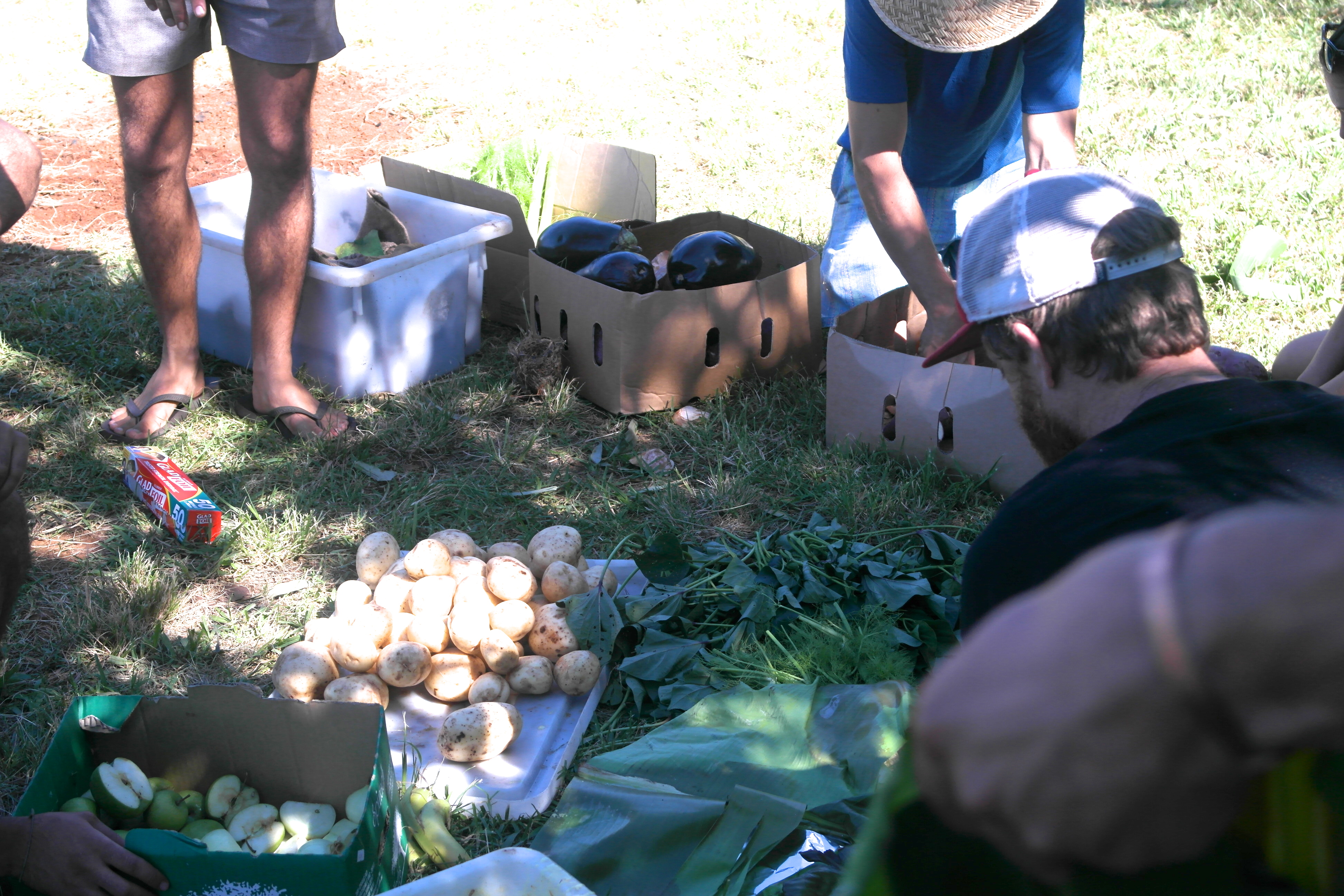 The pig had to be butchered, wood chopped, the fire lit, vegetables chopped, approximately 1 million banana leaves de-stemmed, lava rocks heated, a cage made, dirt dug… and hopefully somewhere during the day we would get a chance to take a shower and maybe drink some beer… well, at least drink some beer. And the only crew that were available were all either hippies or backpackers – both are basically impossible to move if it comes to working… but both really come into their own when it comes to playing a musical instrument or holding a Bob Marley tune. So I felt we shall be doing a lot of the work ourselves.