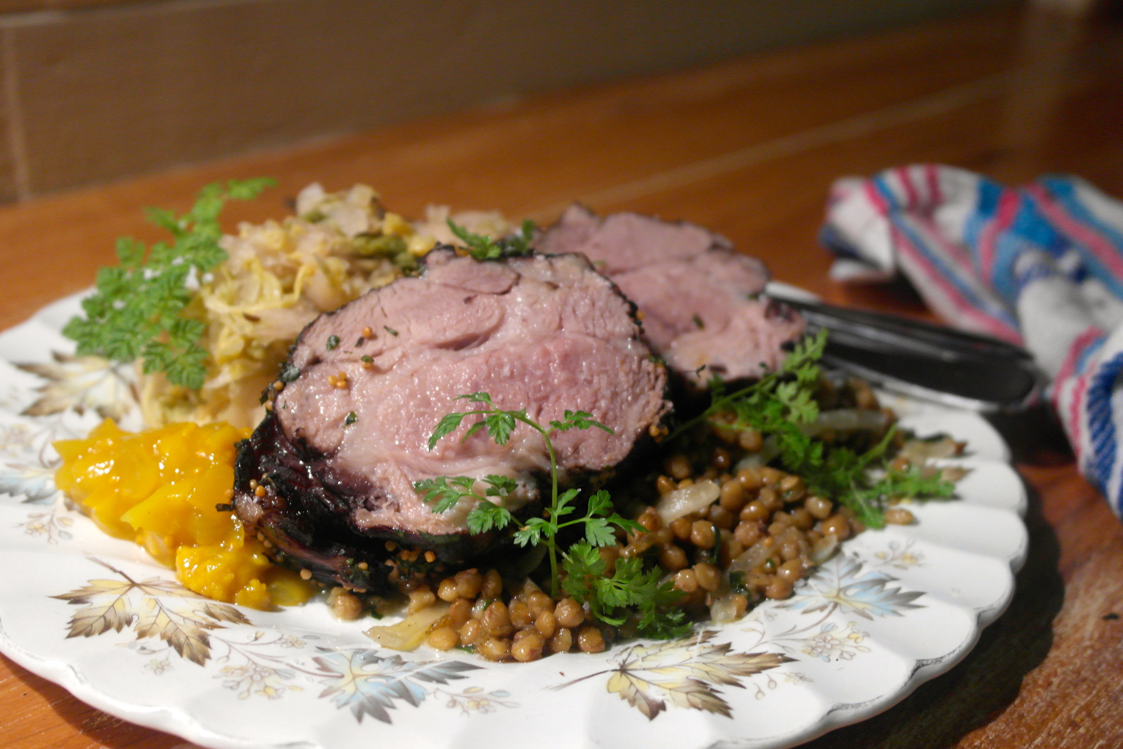 You can cook a piece of pork by now, non? This pork neck was braised in red wine with star anise, thyme, peppercorns and garlic, cooled in the braising liquid and then rolled in mustard seeds and more herbs. The lentils were my pickled lentils, which you can find here, and they were simply warmed through. The sauerkraut is the recipe you can find below (original recipe can be found here), once again simply warmed through.