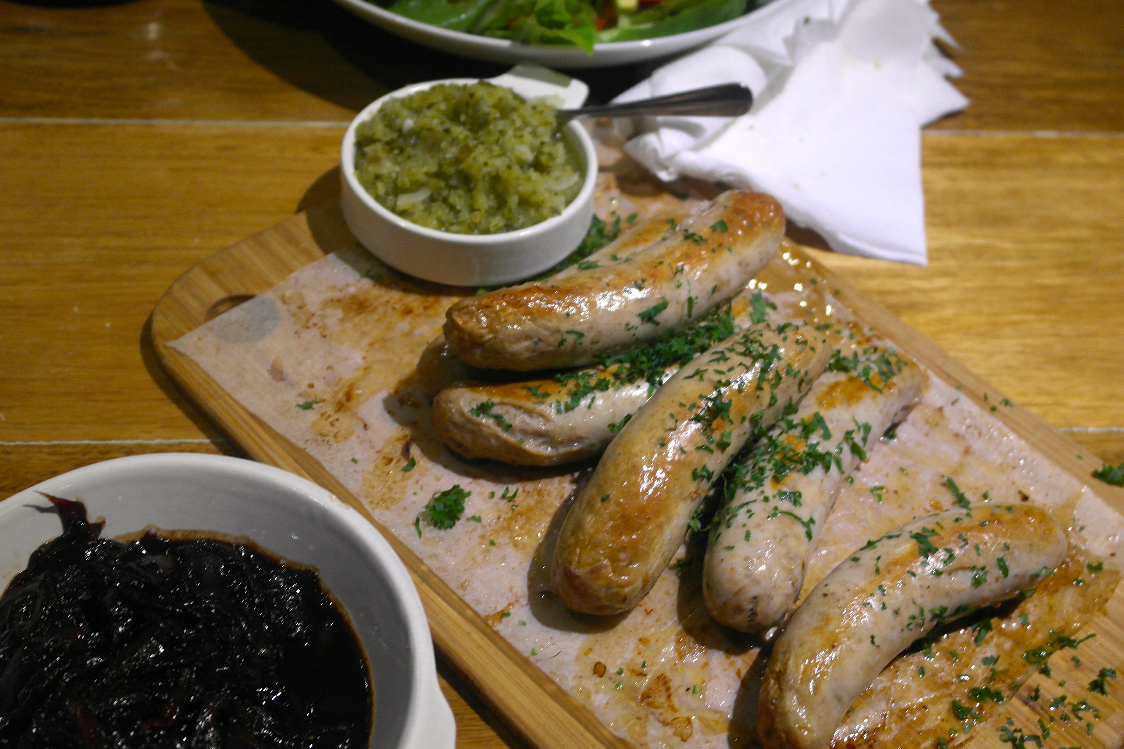 Home made sauerkraut, onion jam, tomato sauce and cucumber relish (recipe below), to serve