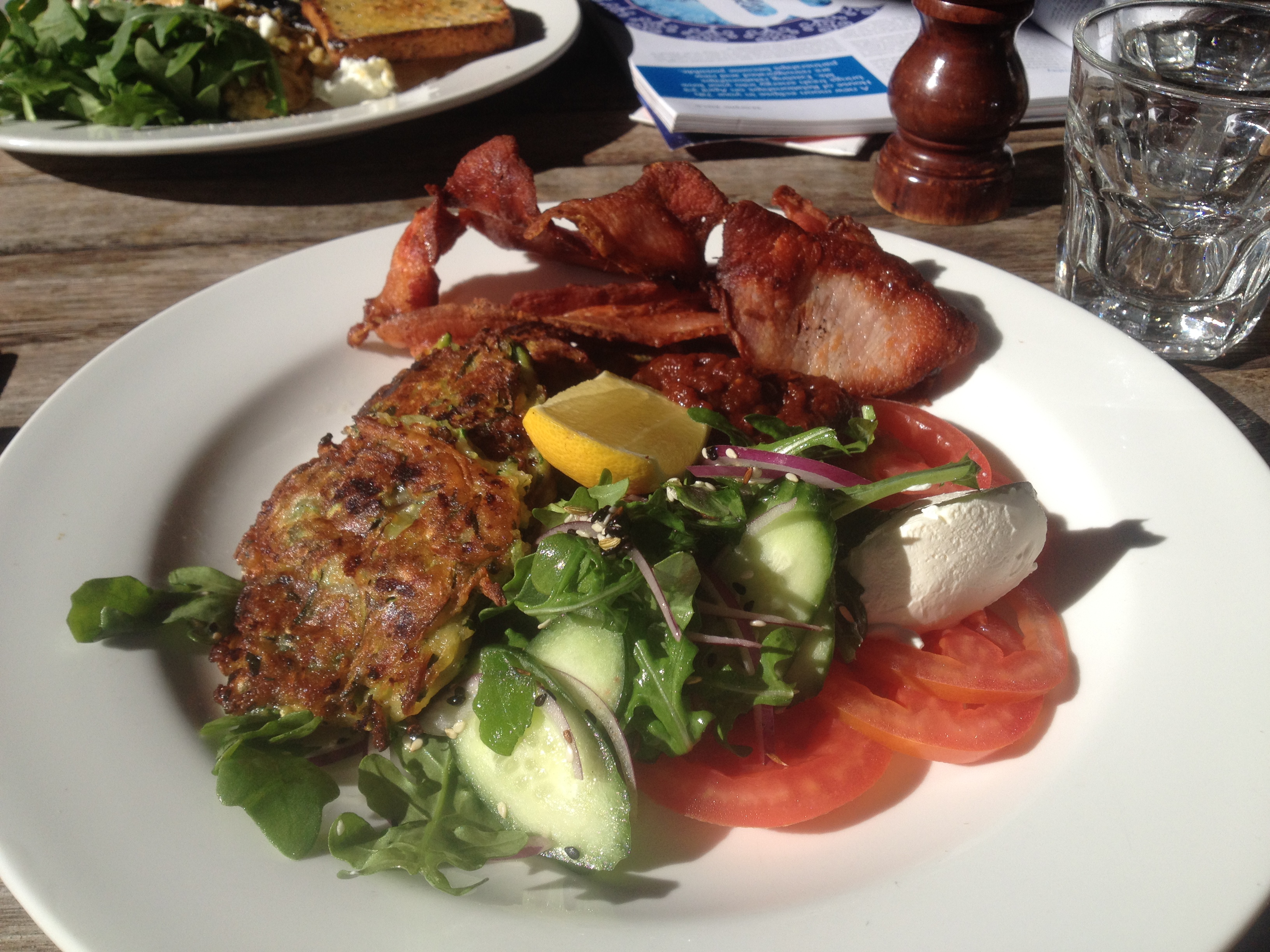 I had the zucchini fritters with a side of bacon. The fritters were no John Holmes, swaying a little bit to the flaccid side of things, but the flavour was well and truly there so they got the fuck eaten right out of them. The bacon was crisp as the morning air though, so I was happy with that. They came with a nice little rocket, tomato and cucumber salad, labne and tomato chutney.