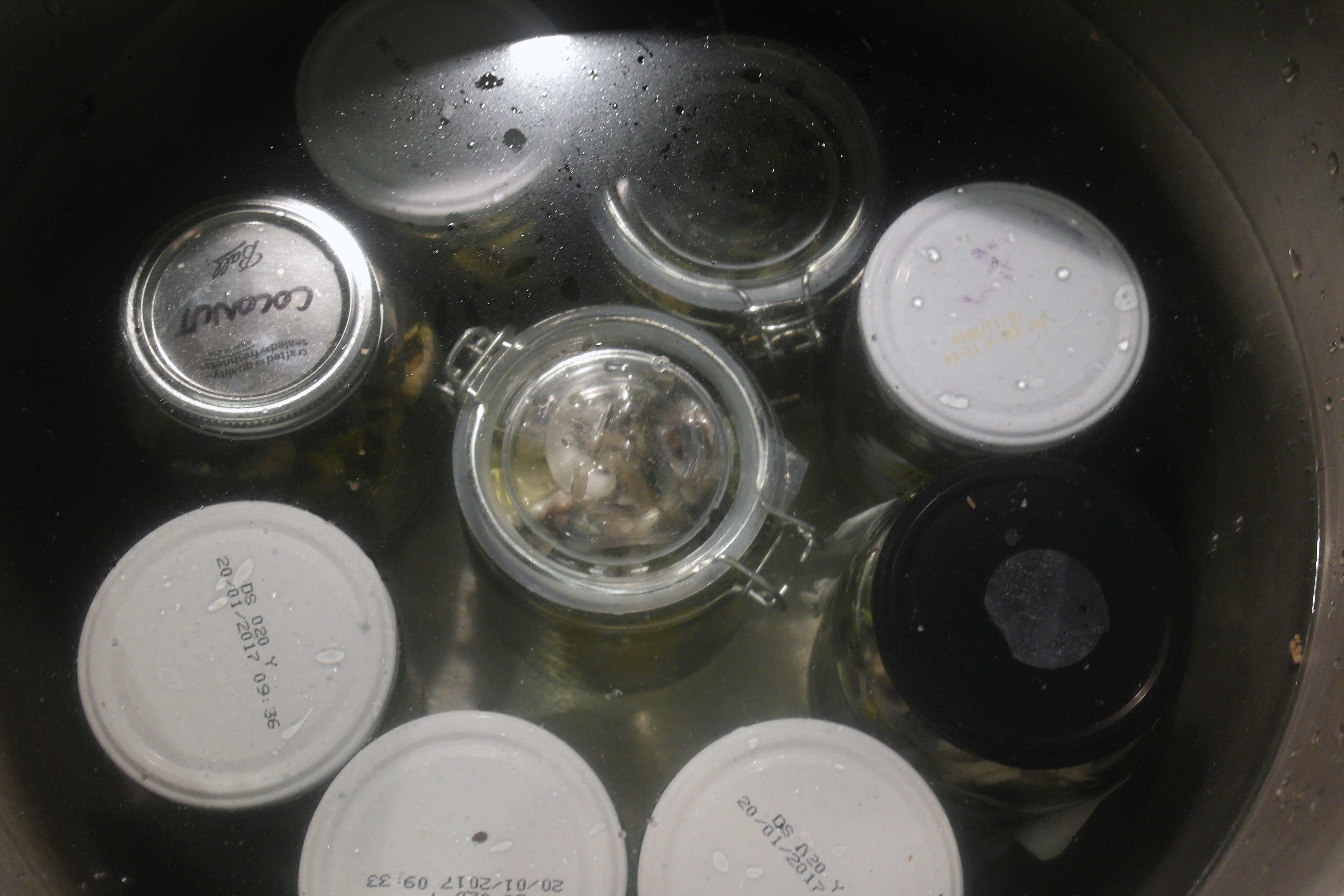 β’ Put the jars into a pot that is deeper than the jars are tall. Cover them with water and bring the pot up to the simmer, simmering gently for 20 minutes. This will cook the sardines and also seal the jars so they will have an extended life
