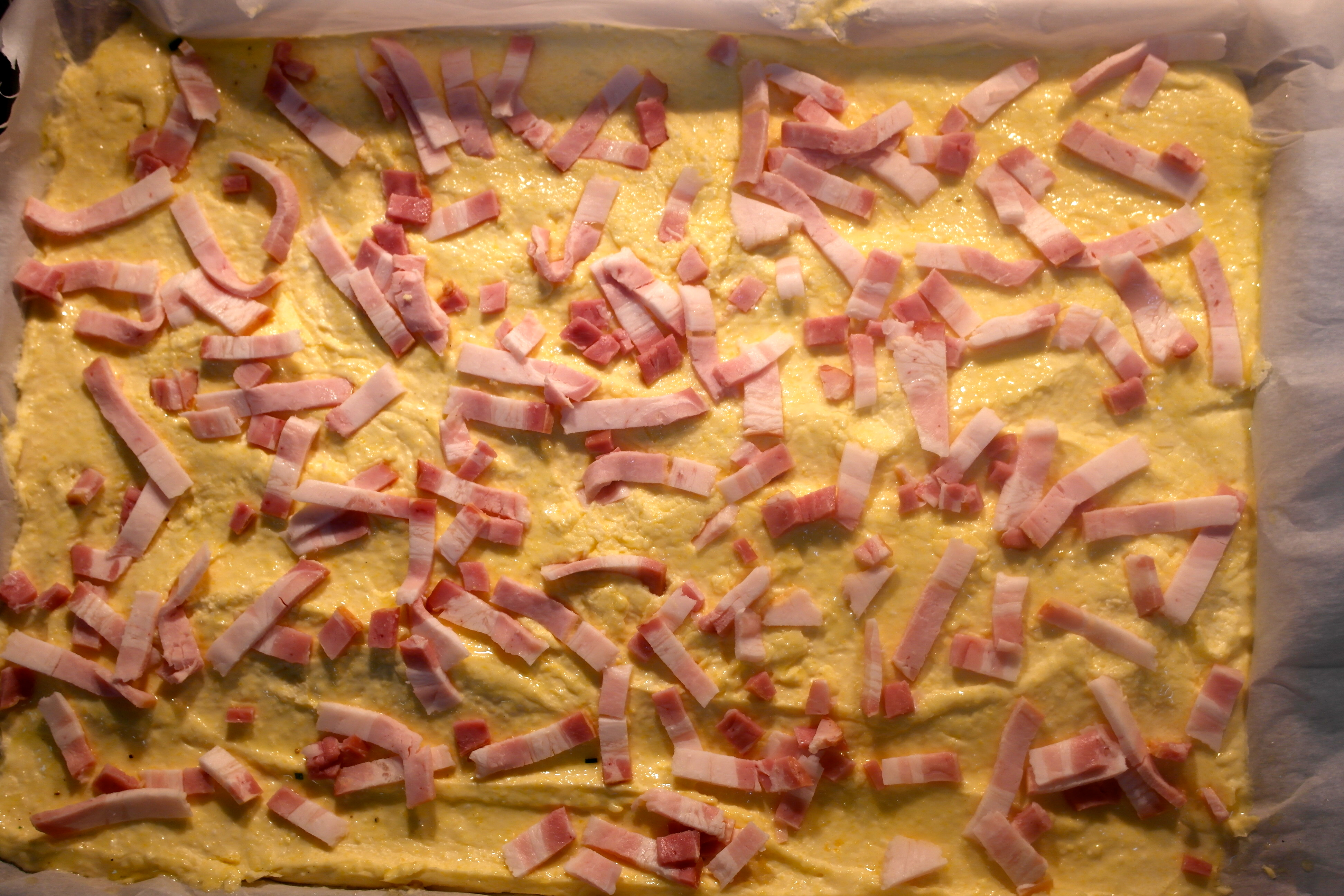 • Top with bacon and rest in a warm spot (the batter that is… I don’t really care how tired or cold you are) for half an hour to activate the yeast