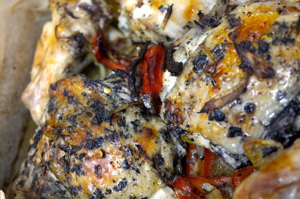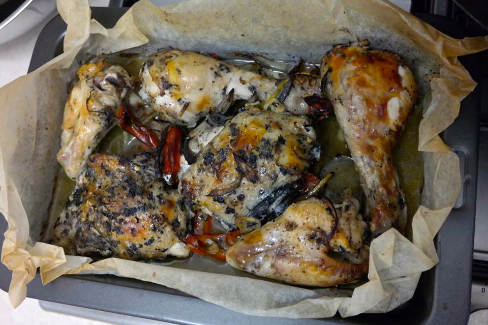 We shall honour this creatures life by simmering its bones into a delicious master stock inspired brothy thing… its once moist bossom will once again be moist with my garlic & oregano titty rub… and to make sure she ain’t going no-where we be roasting the shit out of the running parts and da flying parts, connecting in their heated journey with an olive oily, chilli, lemony, black peppery little number.