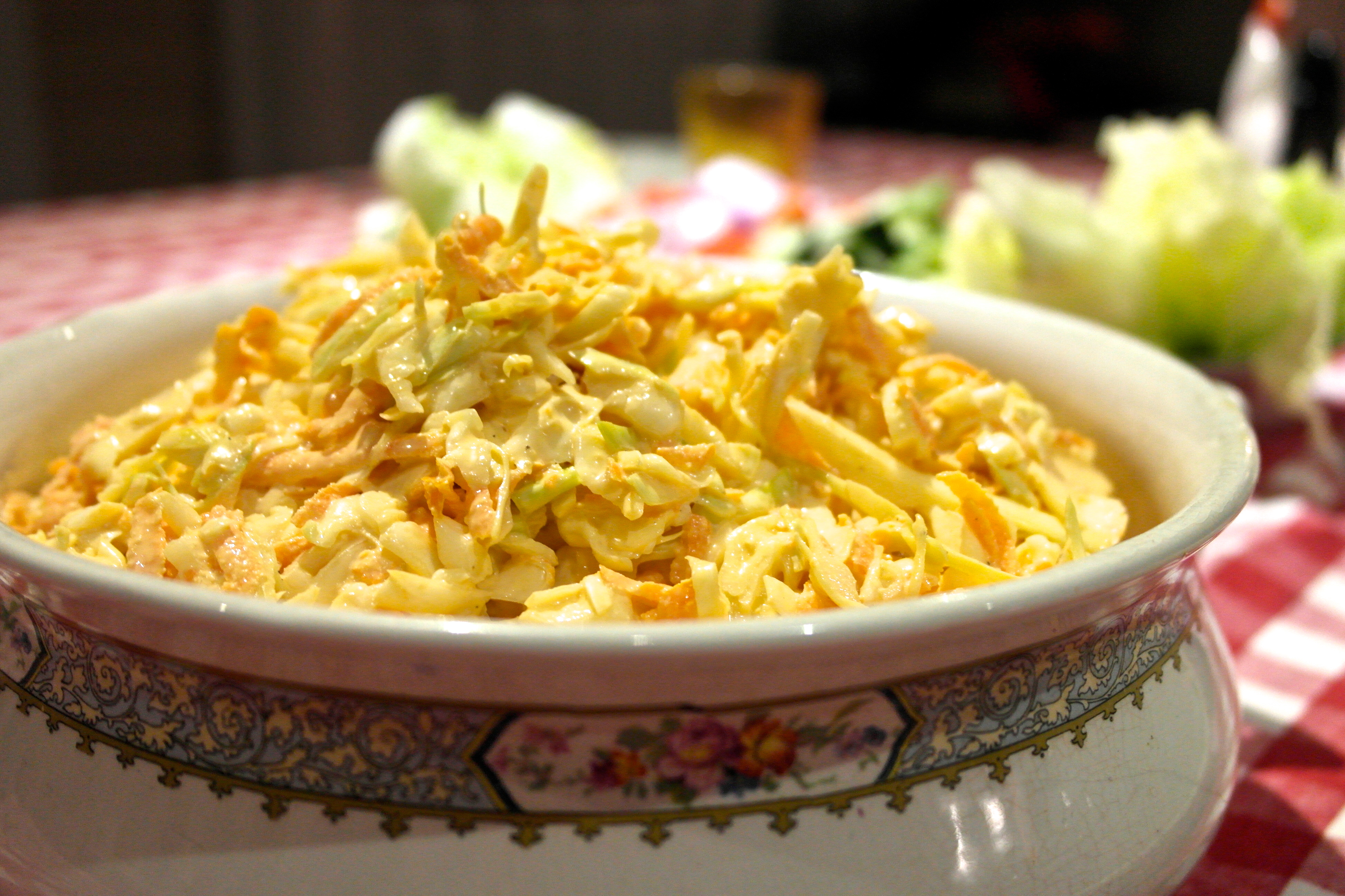 It seems to me, via wiki-pedia and other inter web sites of factual repute, that the Dutch first penned a recipe for modern day coleslaw in the late 1700s (coleslaw derived from the Dutch koolsla; kool – cabbage and sla – salad). There is also reference to the Germans and Polish for their contribution (although I am still not entirely sure what that is), which actually came as a bit of a surprise to me as I was sure it would’ve been an All American barbecue recipe for sure, created by the Yankies just like the nuclear bomb or Coca-Cola except tastier and quite frankly a good thing, as apposed to a terrible weapon of mass destruction. Upon further thought though, I decided it makes lots of sense that this was not a product of the Coca-Cola company and possibly a product of a German-Polish coalition, as that is quite literally how I made my way into existence and hence would explain the love I have for this shredded cabbage salad. I don’t even think love is a strapping enough word. Love is the kind of word one would use when talking about their marital partner or possibly their children, their favourite animal porn web site or even their favourite flavoured ice cream cone at the local Baskin Robins. I think the word that I need to be using is addicted. I am addicted to the consumption of coleslaw with every part of my being. I don’t care what effing season it is, how cold it is or which Queen-of-effing-England is coming for dinner, there is always a place at my dinner table for coleslaw… there may not be enough space for you, but coleslaw can wander in anytime. There is a little plaque with “coleslaw” engraved on it, much like what you would see at the parking space of a company president and yes, it is a tow-away zone. There’s no way the potato salad or tabouleh is going to get to sit there, just on the off chance the coleslaw might show up!