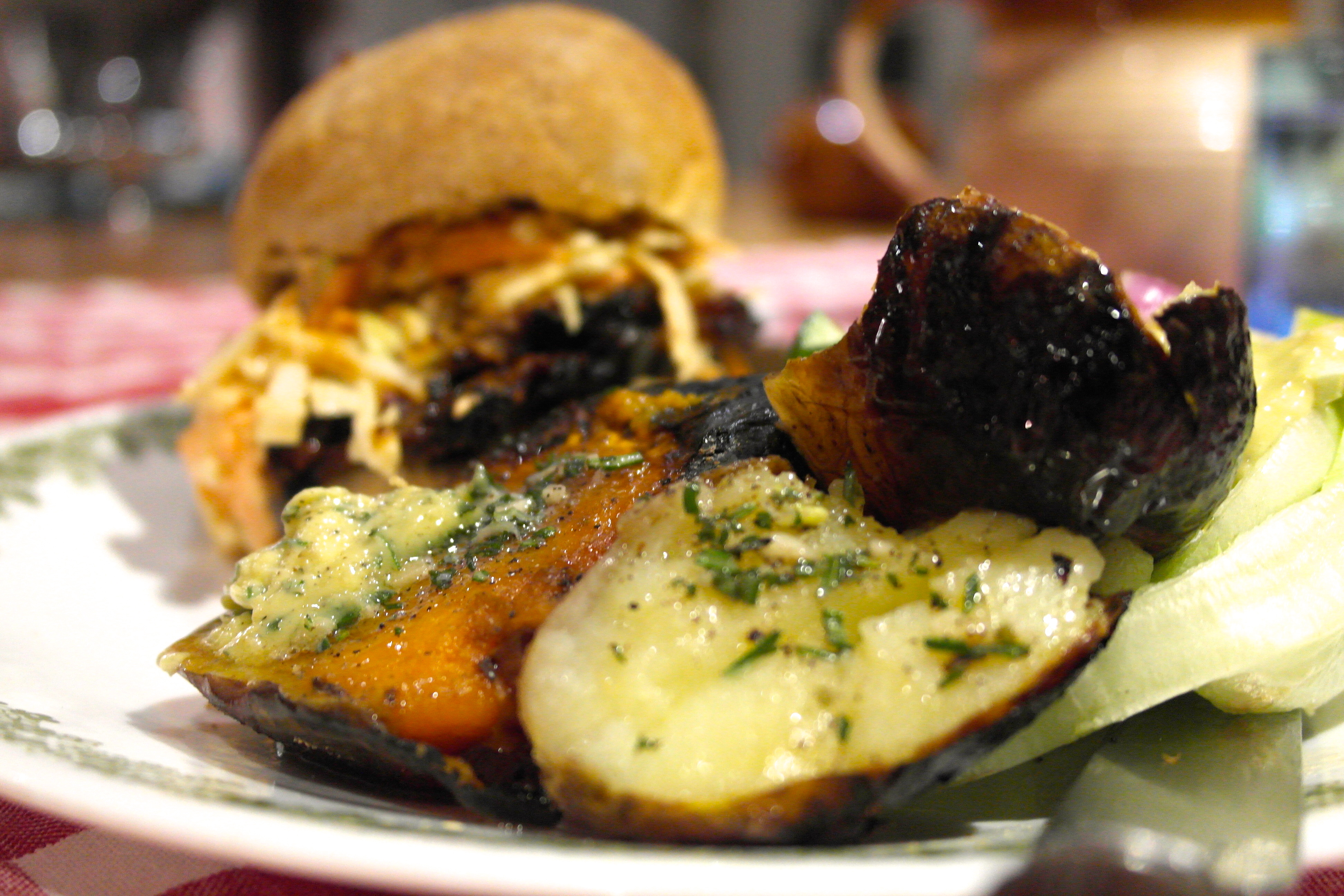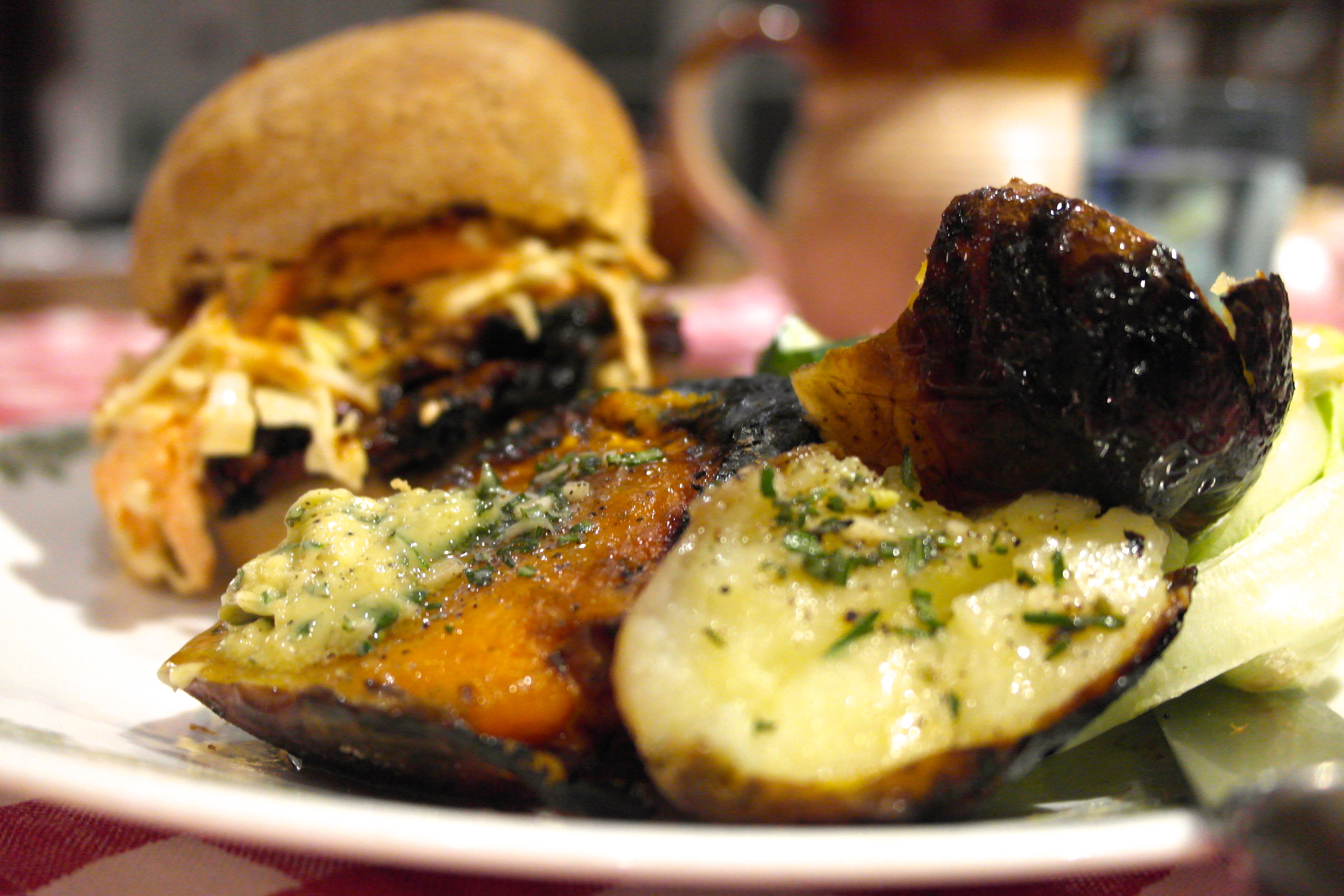 Brisket and coleslaw roll with garlic butter potatoes from the coals