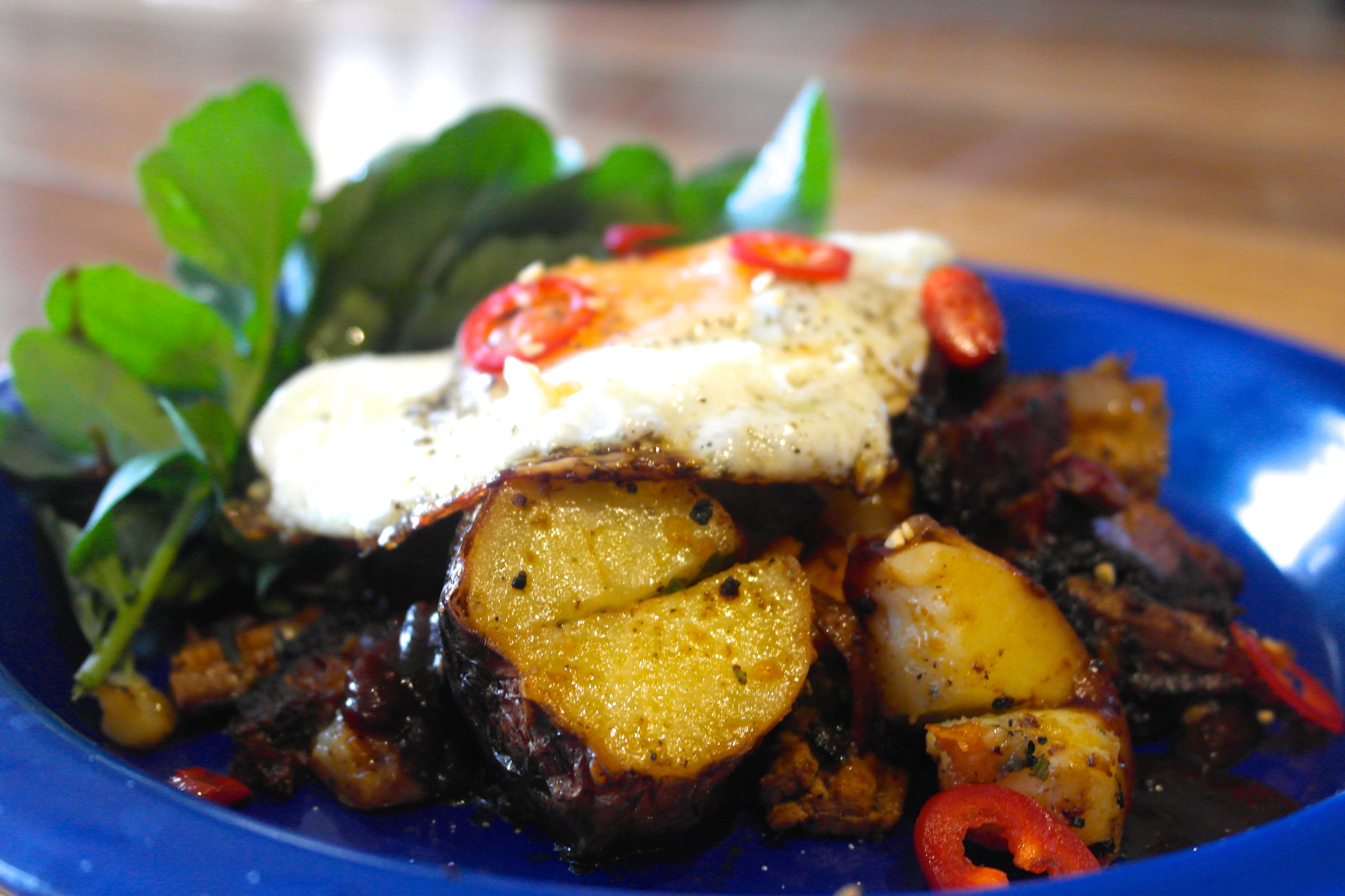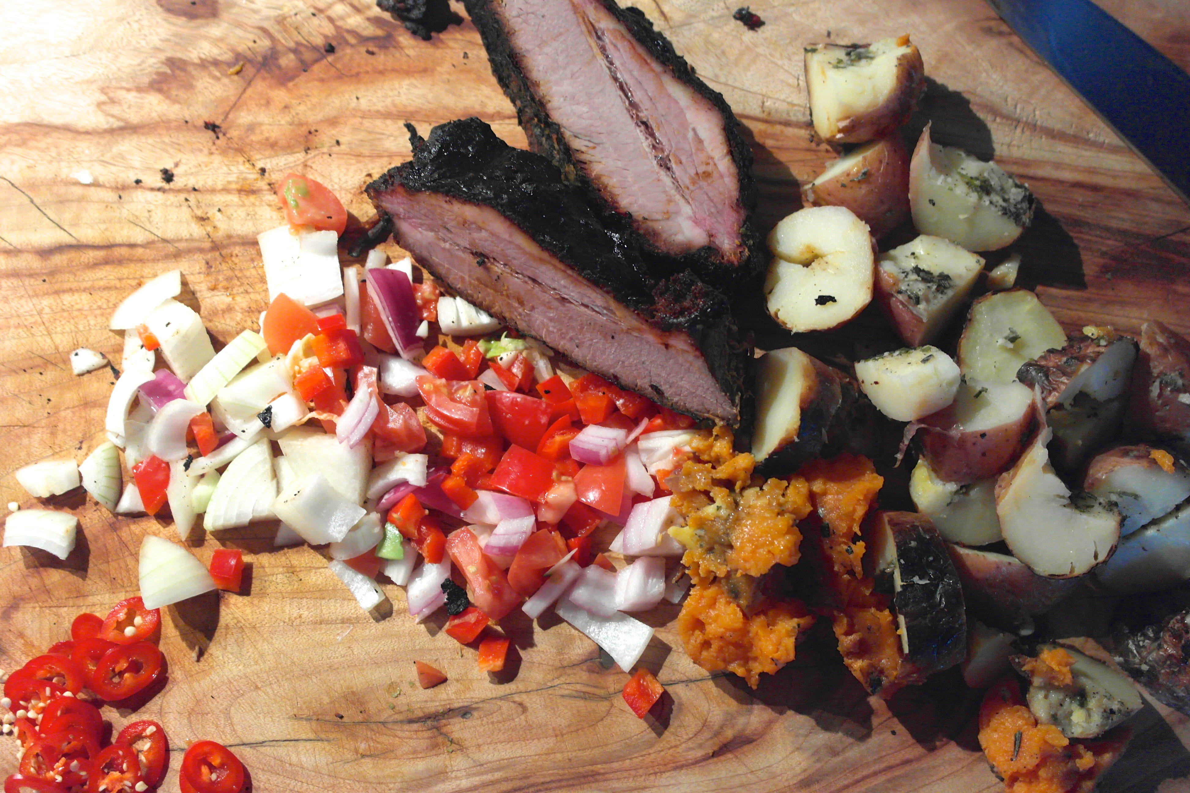 When you have a bit of brisket left over from your barbecue, and maybe a few of those coal roasted potatoes and the garlic butter that accompanied them, and possibly a bit of chopped onion, tomato and capsicum left from that salad, I feel there is but one thing a young man can do… and that one thing is not to make a weird sex film for the inter web super highway starring one man and his dinner. No, there are plenty of those about already. That one possible scenario I can take from this is to make brisket and potato hash!