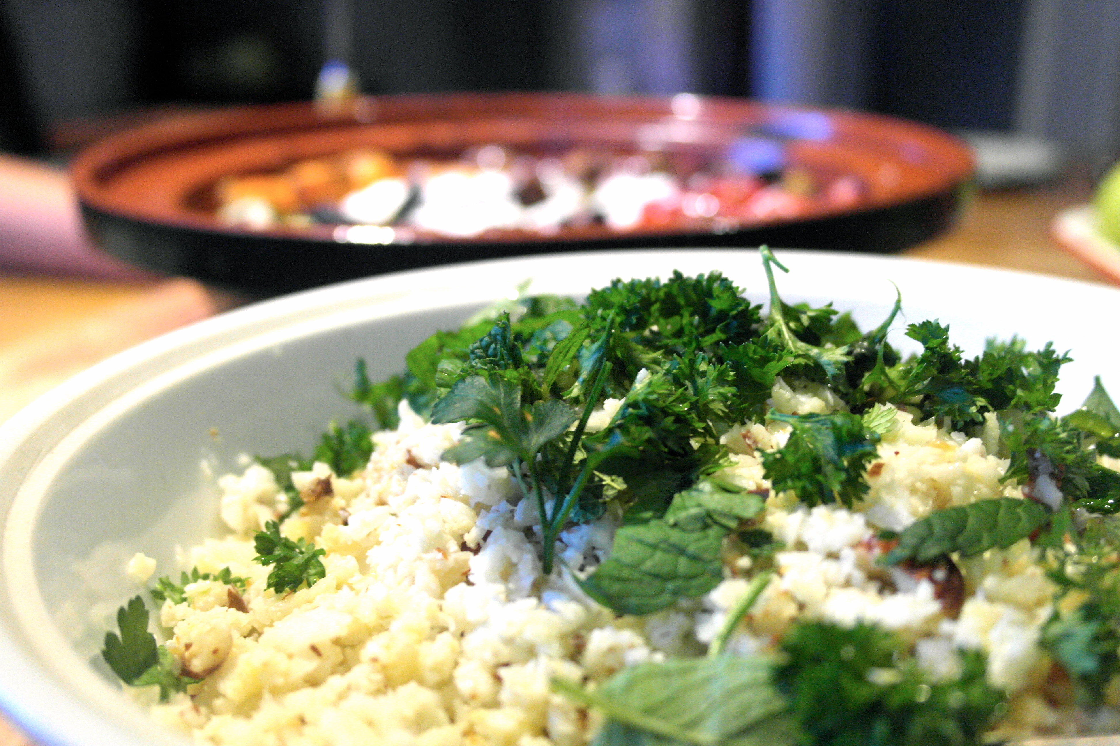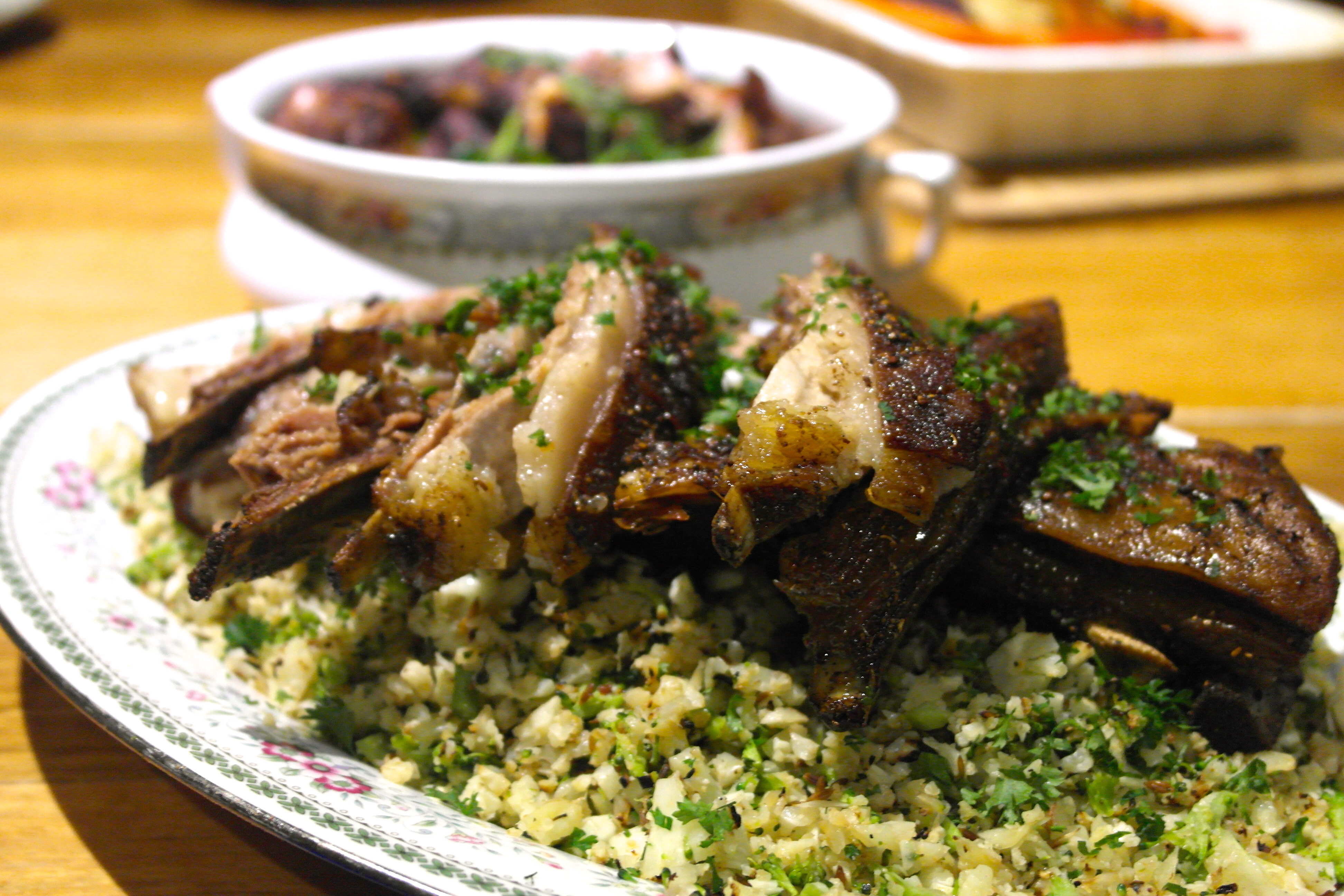 Wow delish. You may have seen the caulicouscous on my blog…http://sercocinera.wordpress.com/2014/07/23/spiced-cauliflower-couscous/….but by far I did not invent it. I think I saw some paleo friendly site. I think it’s a decent substitute. You just have to make sure you spice it well and disguise it. Those ribs look fantastic. No grains..wow. At least you’ve got this! However I just discovered the joys of bulgar so there’s just no way this would work for me. It is a great substitute though. For realz. Good luck to Jennee!