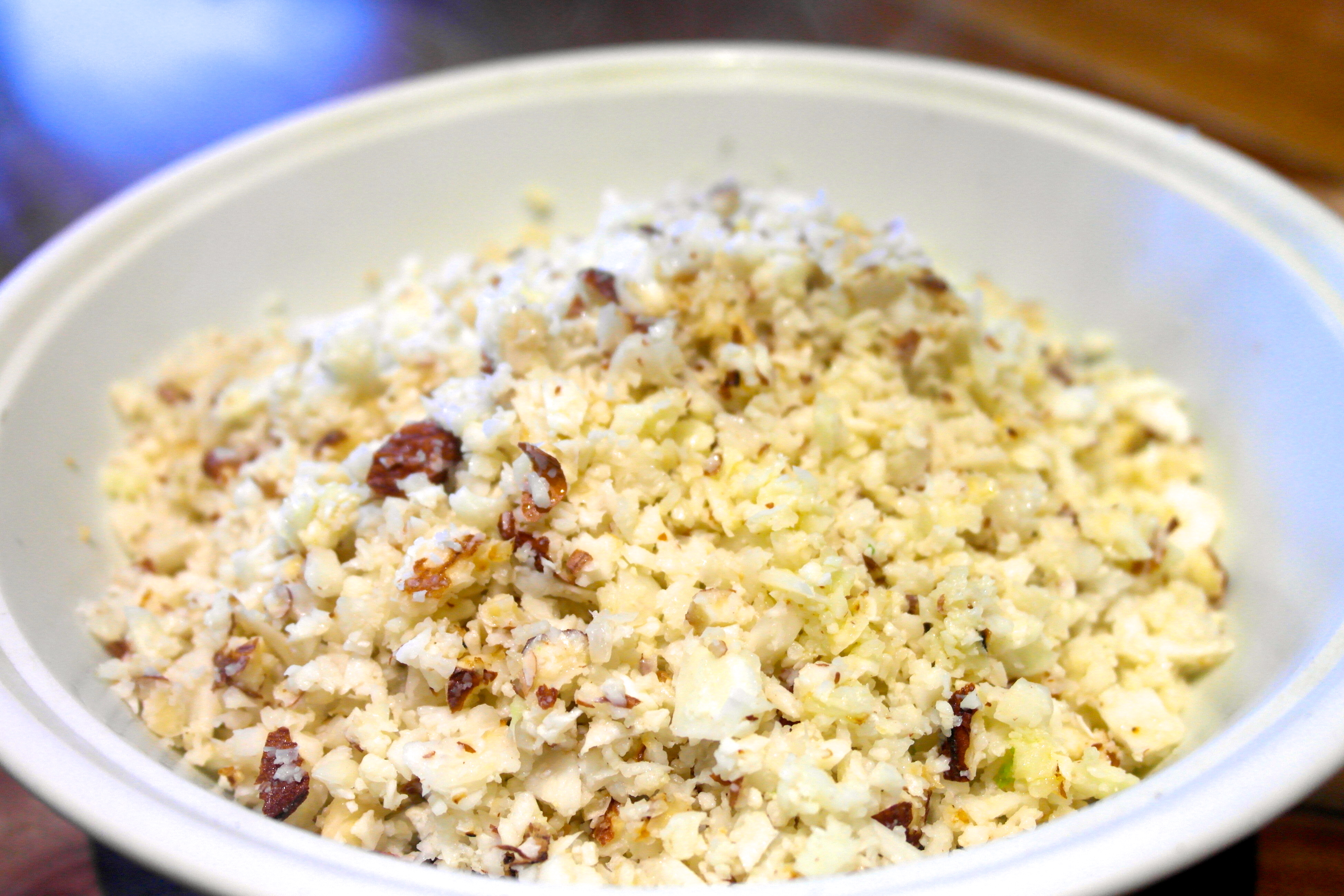 • Pulse cauliflower and nuts in a food processer until fine and crumbly – just like cous-cous (Do it in three or four batches for an even crumb)