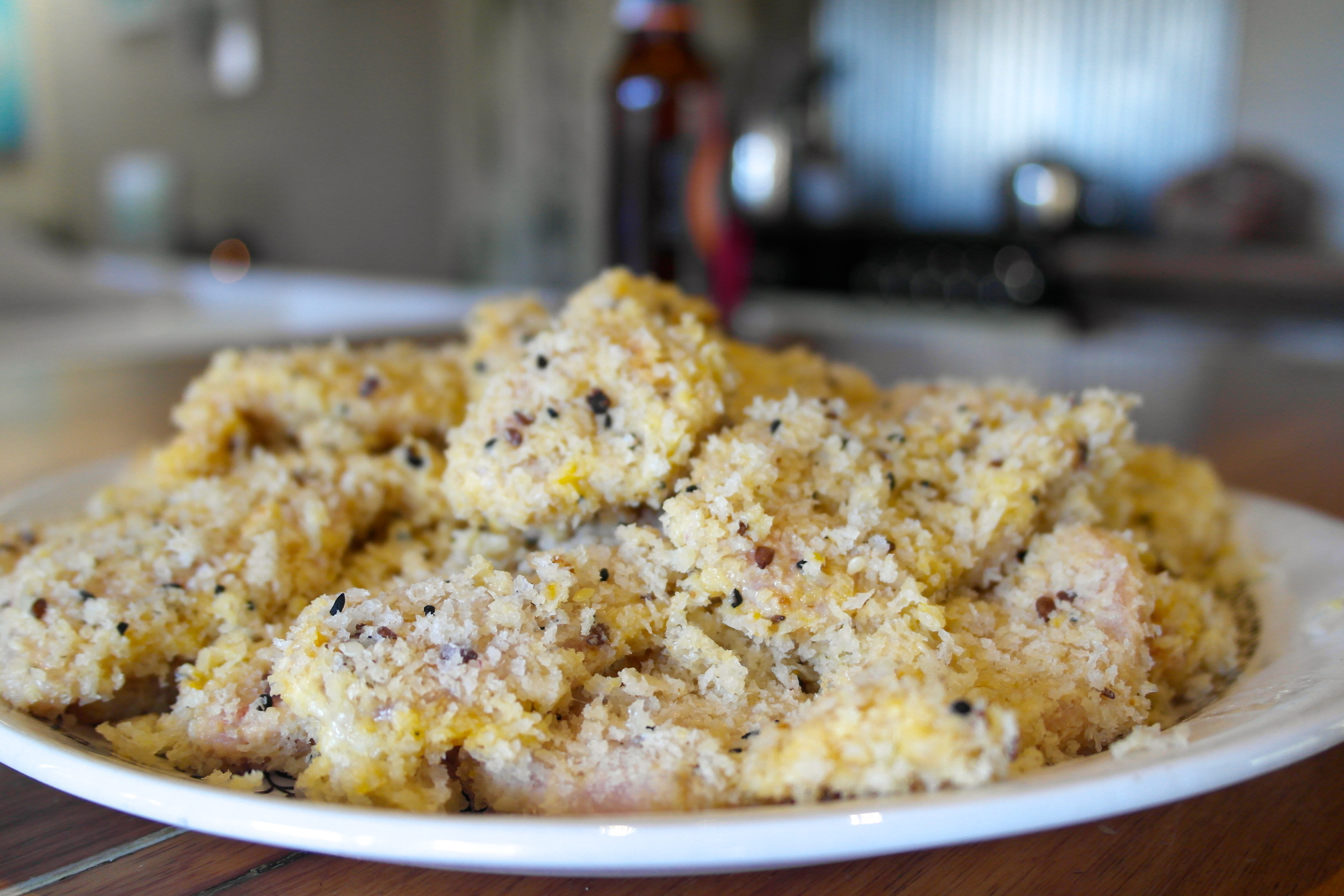 Breadcrumbs (crumb a GF loaf if you canโt do the wheat), flour and egg mix to crumb