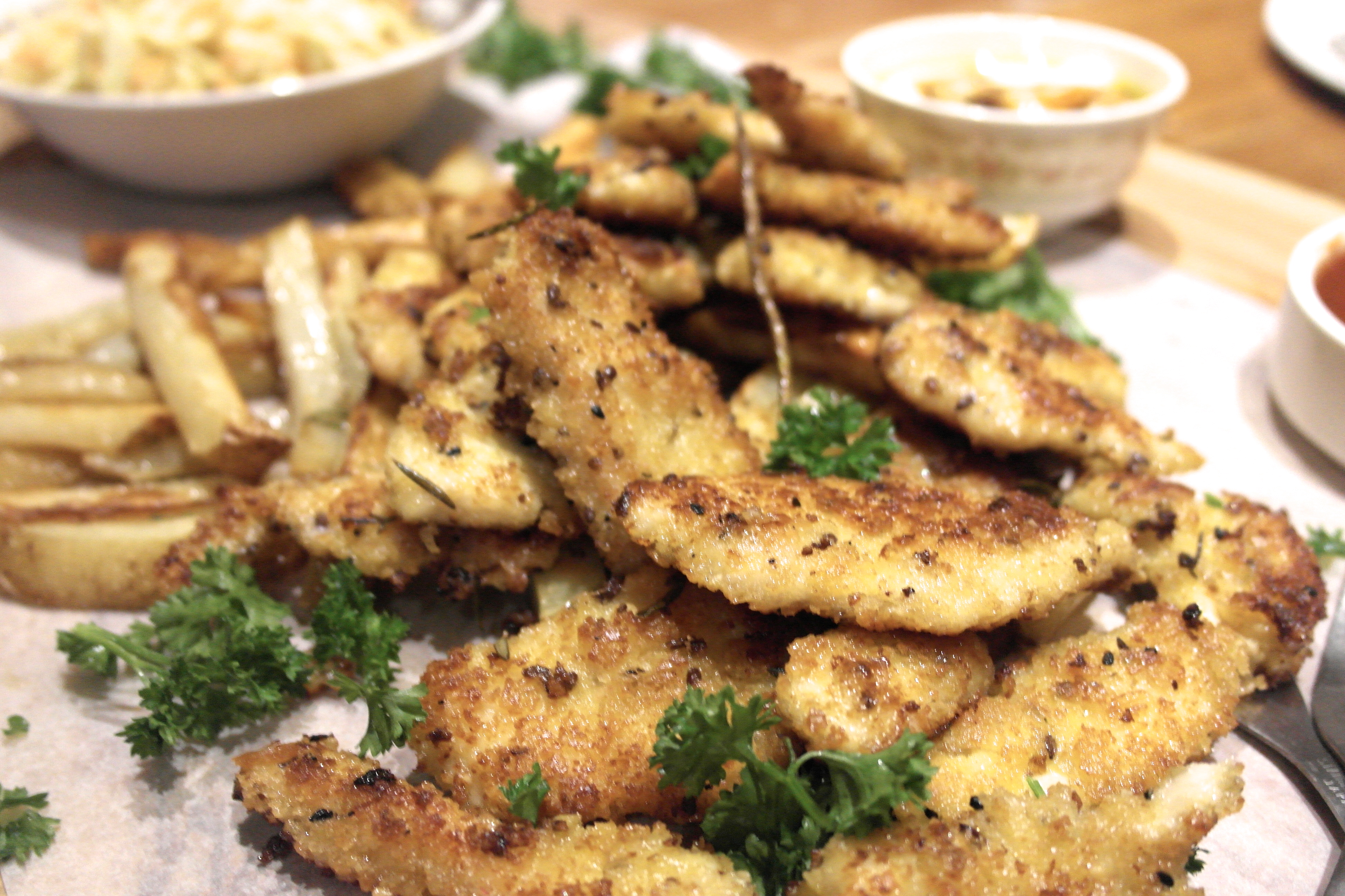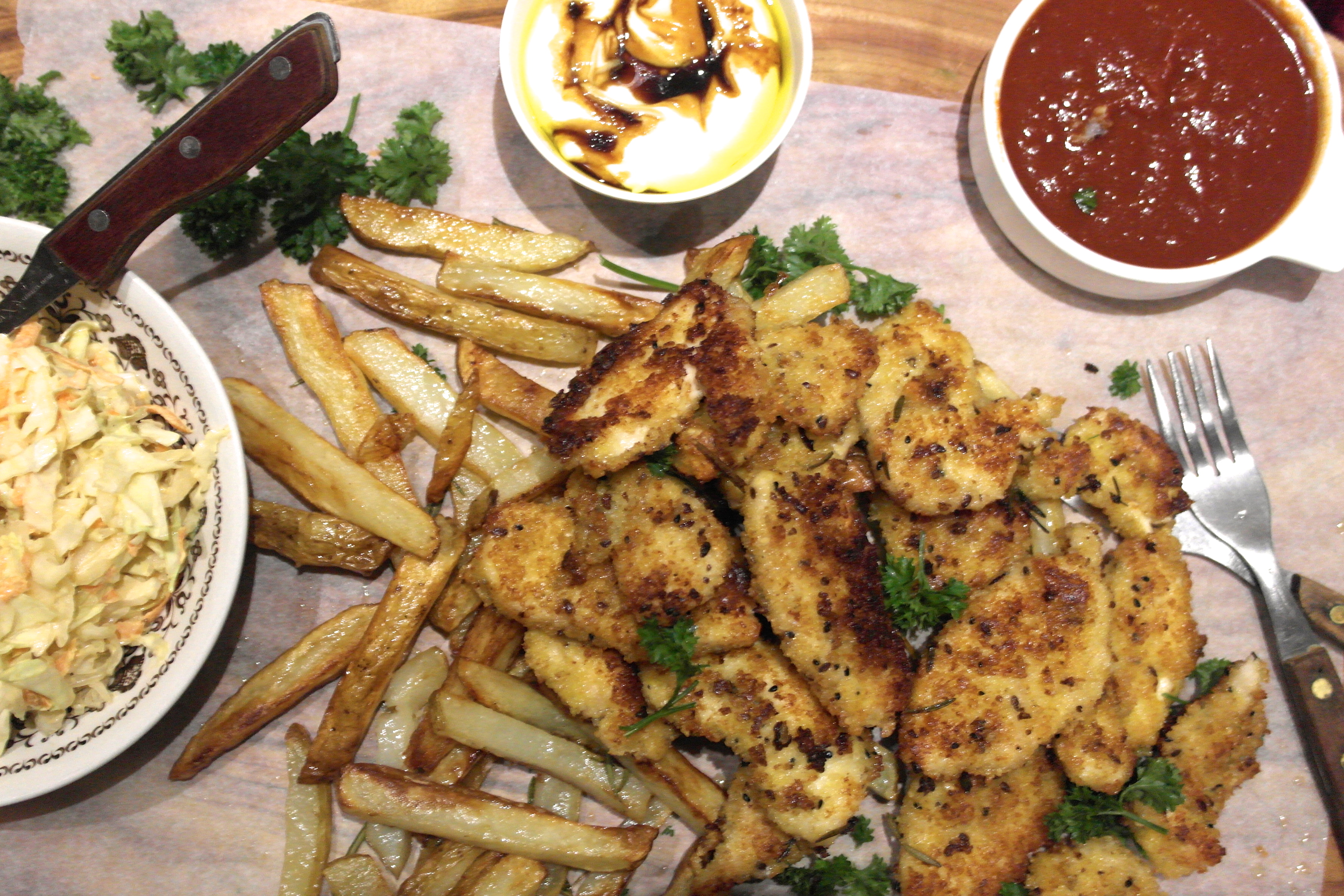 HOME MADE CHICKEN NUGGETY THINGS with OVEN CHIPS and COLESLAW (for 4)