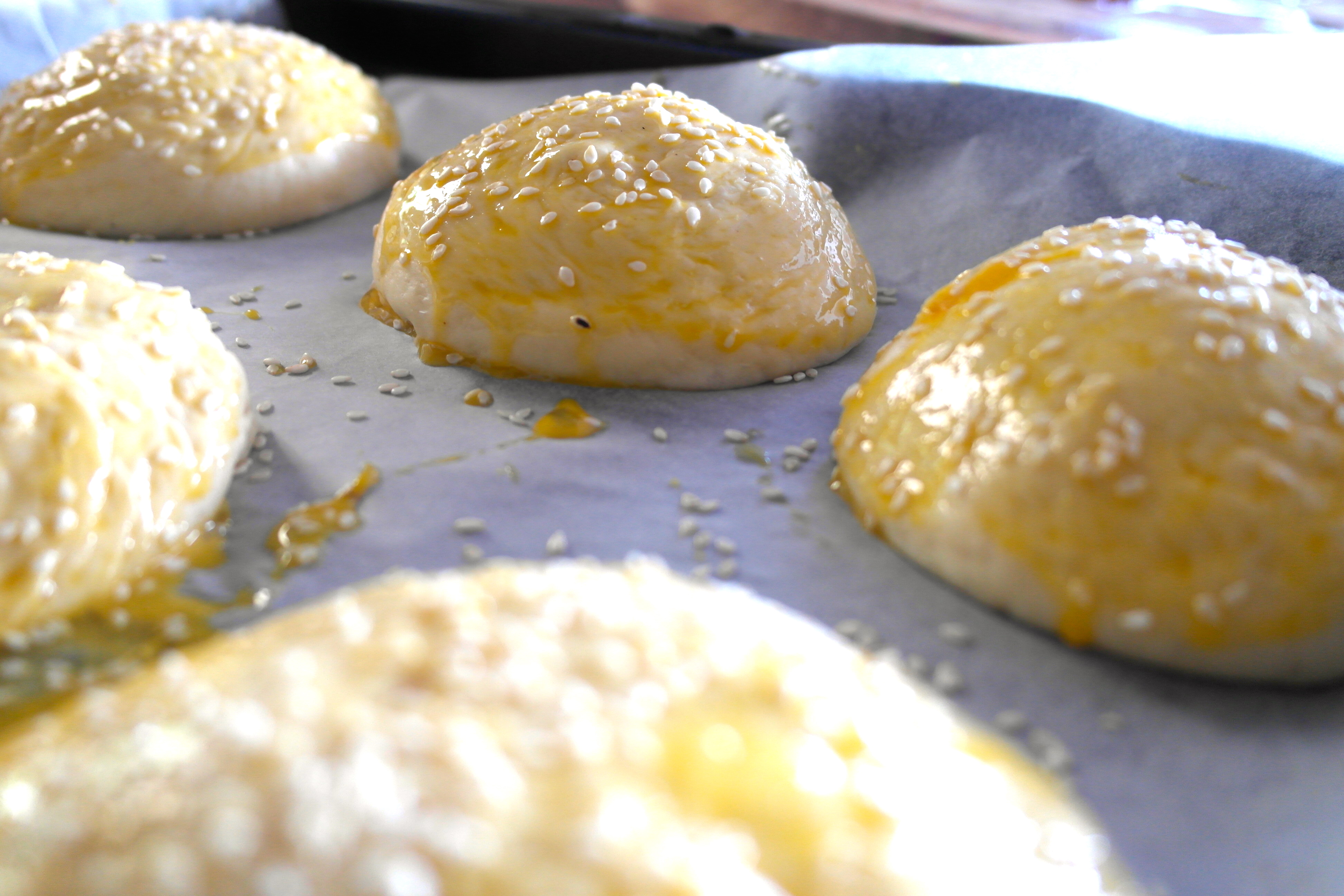 • Glaze with egg and sprinkle with sesame seeds, then bake in a pre-heated oven at 180C for 15 minutes