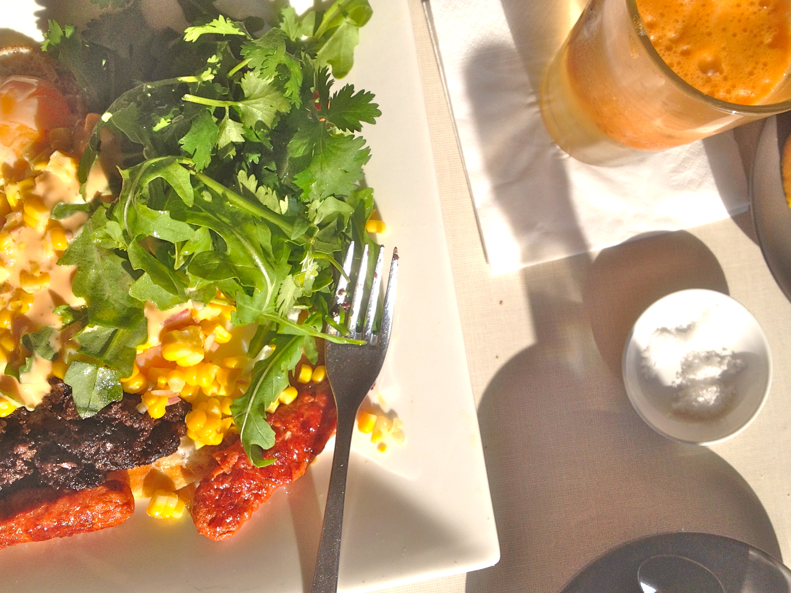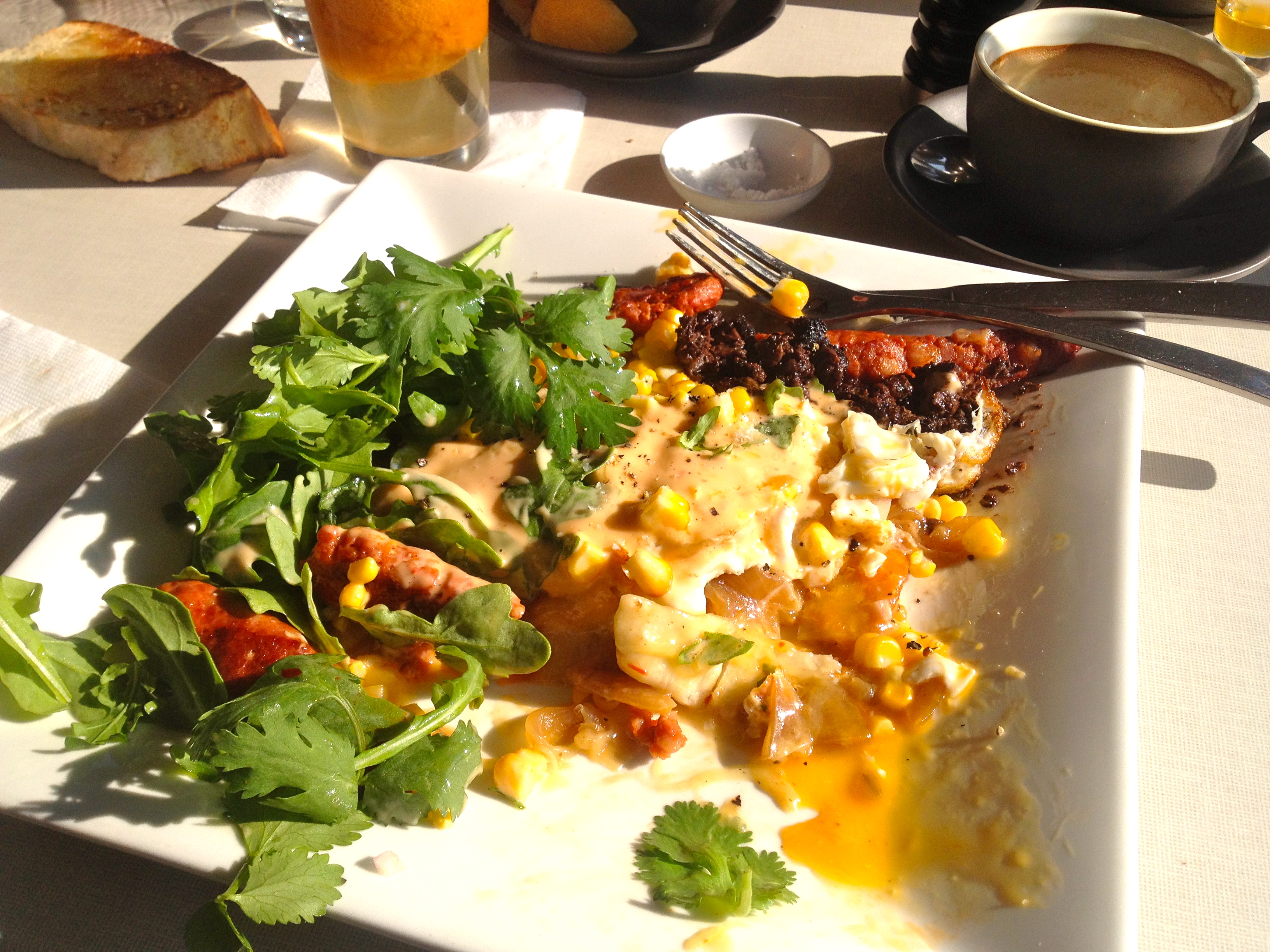 I ordered the caramelized onion quesadilla with a side of black pudding (I shouldn’t have bothered as most of it was scoffed by the younglings), which also came anointed with the canopy of a tropical rainforest. Once I had hacked my way through the foliage though, it revealed a tasty breakfast. It’s not that I don’t like my greens, I just think that shit needs to be manicured, much like the “other bush” which we shall not be discussing today. Maybe the thick layer of greenery was a form of insulation to keep the meal warm? Anyway, the quesadilla was damn tasty, oozing it’s cheesey-caramelised onion filling all over my plate… and beard if I am to be totally honest. The eggs were cooked perfectly, the chorizo was awesome (I heard it might be home made) and the little saucy number that adorned the dish was just what it needed to complete the package. Magic.