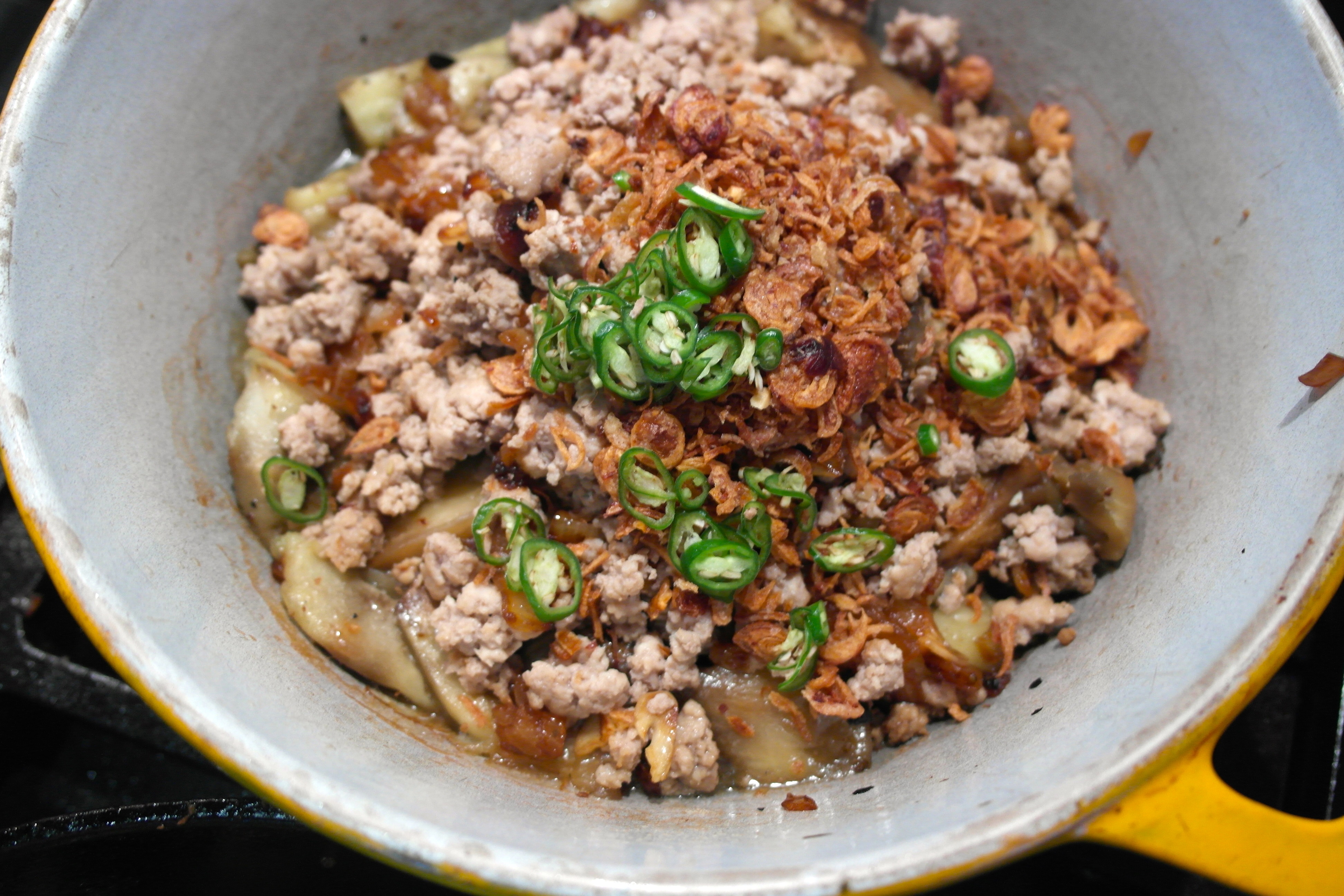 • Dress eggplant with soy sauce, sugar and a splash of stock/water and the spoon pork mix over the top