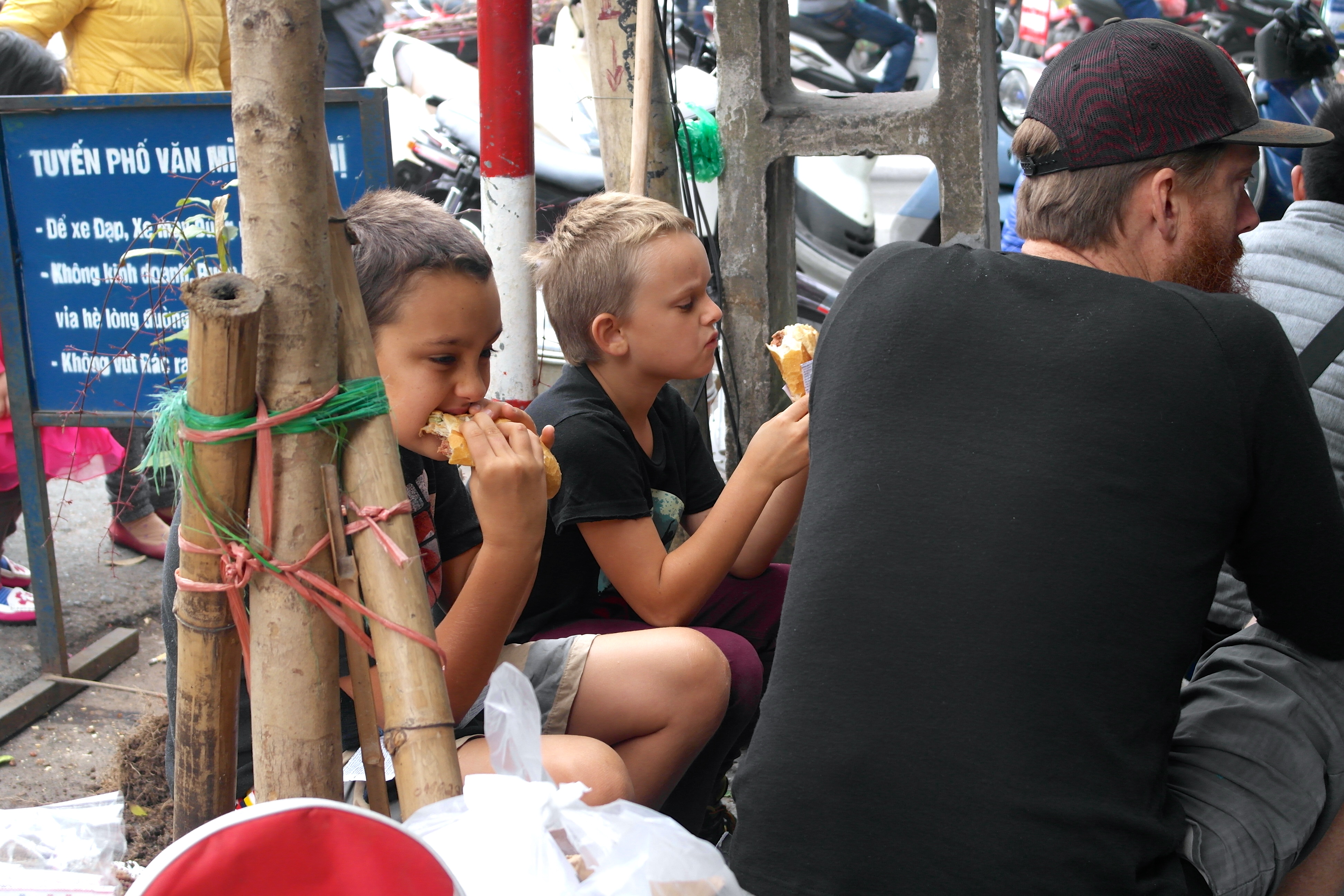 The lady at the banh mi stand beckoned us toward a small plastic chair – a chair that would be part of a young child’s play set – which was where we would sit to eat our banh mi. This arrangement was clearly more suited to the smaller people of Asian descent who were swarming the footpath around me, but on that child’s play set is indeed where we sat and ate our first banh mi.