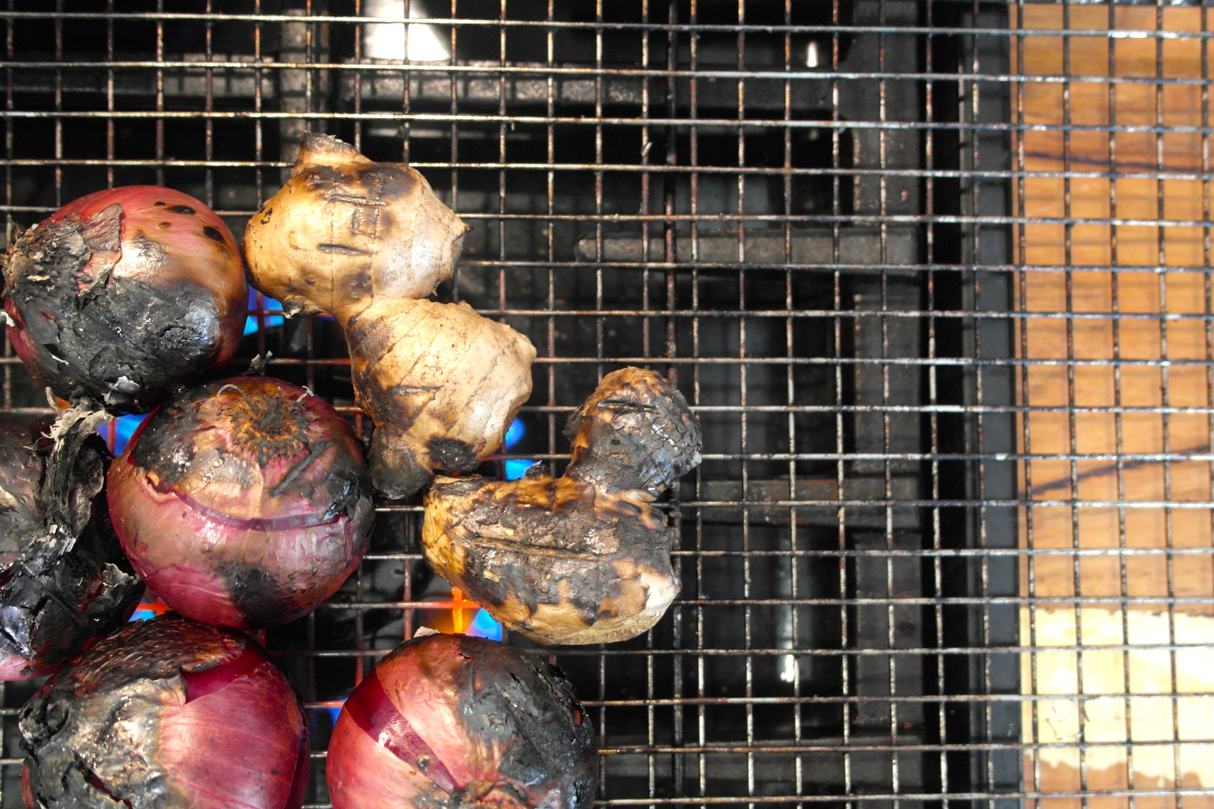 • Grill onions and ginger over an open flame for 5-10 minutes until nicely charred. Chop roughly