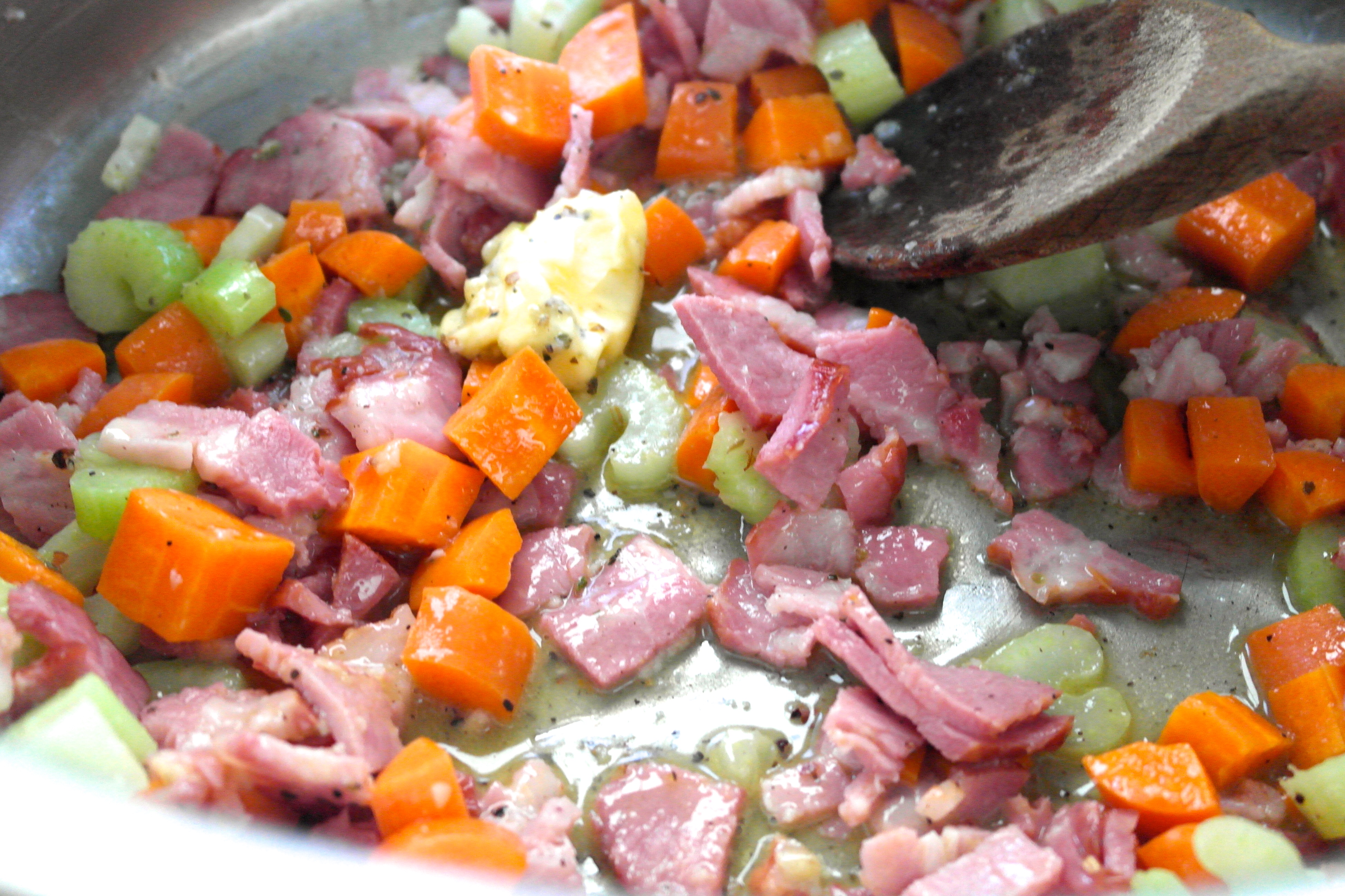 • Heat a heavy based pot over a medium flame. Add bacon, onion, carrot, celery and garlic butter and sauté for a few minutes until they start to almost get a bit of colour