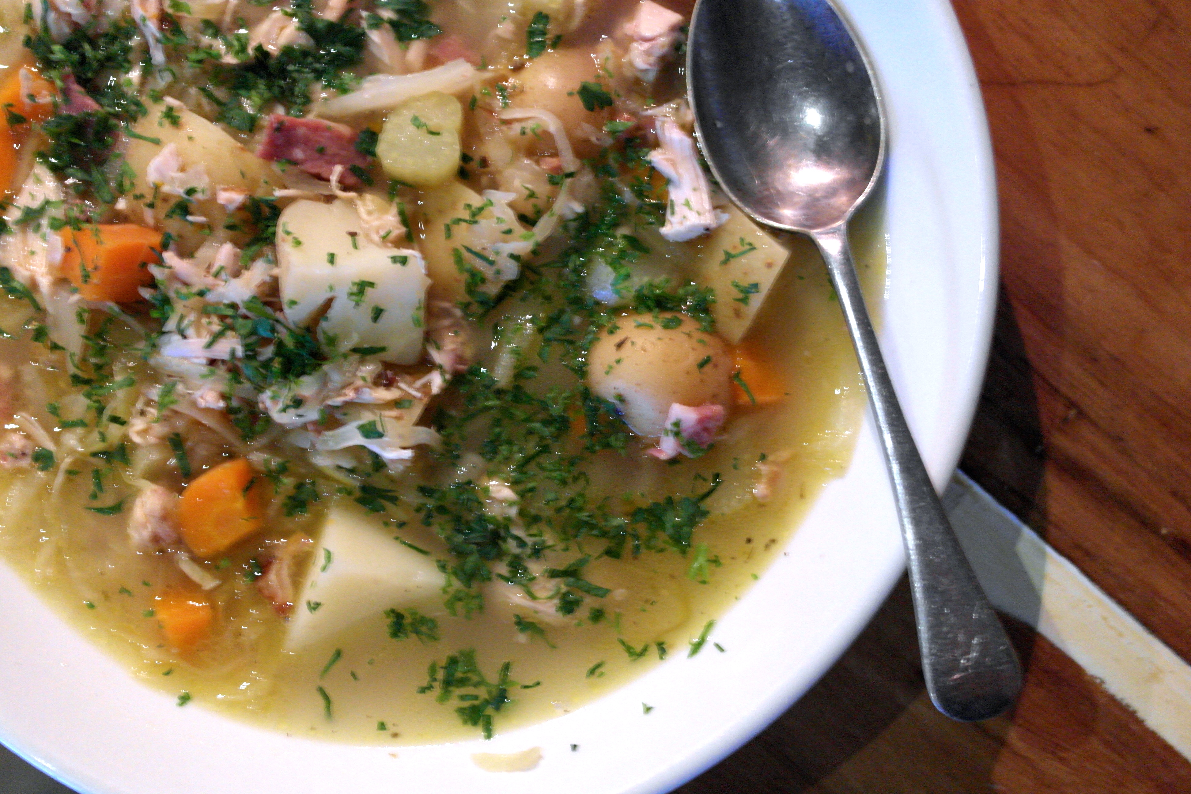 I had some nice, smoky Borrowdale bacon in the fridge, I had some shredded roast chicken in the freezer, I had some potatoes in the cupboard and I had some sauerkraut in the downstairs fridge. I always have sauerkraut in the downstairs fridge… a great big effing bucket of sauerkraut. So you know what? I chucked that stuff and a couple of other veges in a pot (in an order that would make sense. Don’t just go chucking it all into a pot. I will reveal all in the full recipe below) and sweated it off in some garlic butter (left-over from the garlic bread we made to go with those mussels), added a few liters of stock… or maybe it was water… yep, it was definitely water, and simmered it for an hour until it was all delicious smelling and my face was begging for it. Literally begging for it, pining and shit. Dirty little whore face.